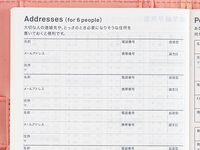 The address book allows you to write in the contact information for up to 6 people in the Original Size and 8 people in the Cousin Size.