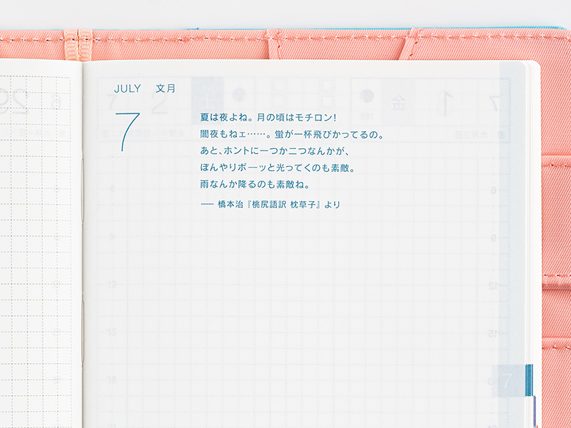 We’ve included a page at the beginning of each month for highlighting important dates, making to-do lists, and writing other notes to help in planning ahead. The page includes a Japanese-language quote from literature and poetry.