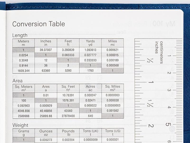 This chart features conversions between units of measurement for easy reference and calculation, including a small ruler to measure centimeters and inches.