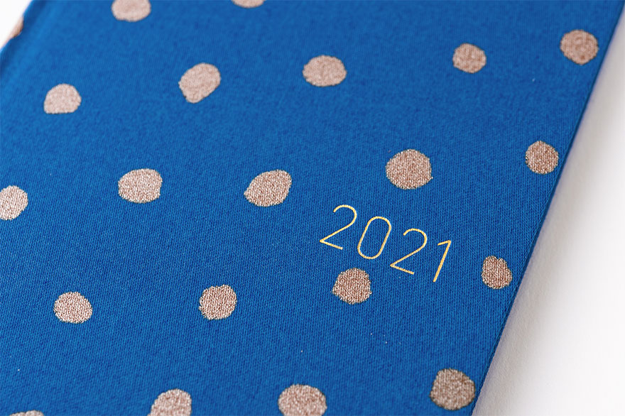 The numbers of the year are stamped onto the cover in metallic or other colored leaf, so strong rubbing or everyday use may cause the numbers to peel off.