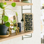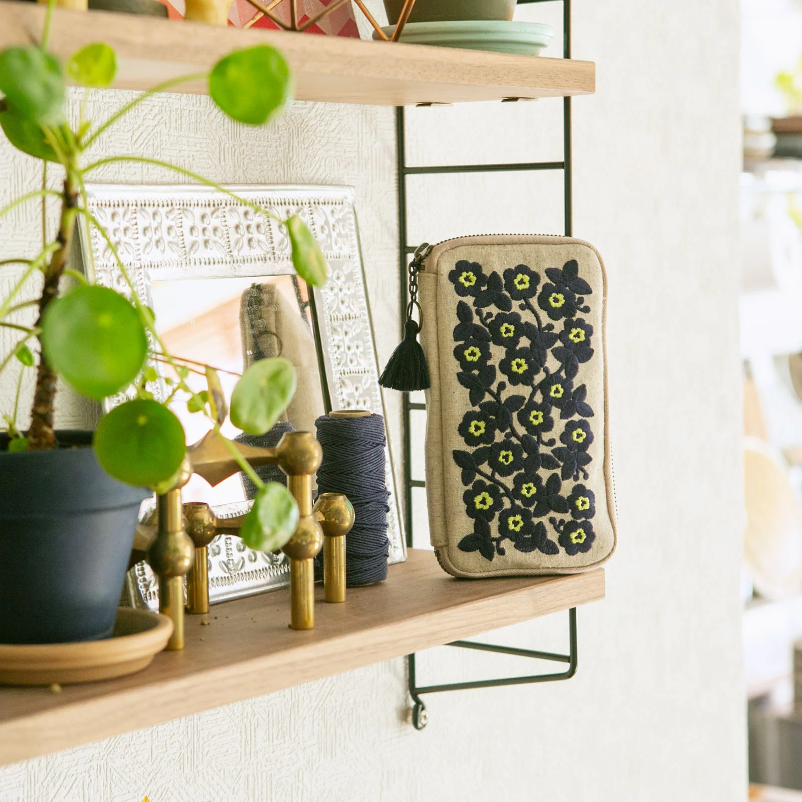 This Drawer Pouch features the design Ukrainian Flowers, which was a big hit when it was released as a techo cover. The design is based on the beautiful embroidery of traditional Ukrainian clothing, sorochka. Simple linen material is embroidered with navy and neon yellow threads. The interior is beige, and the zipper includes a navy tassel to match the floral embroidery.