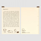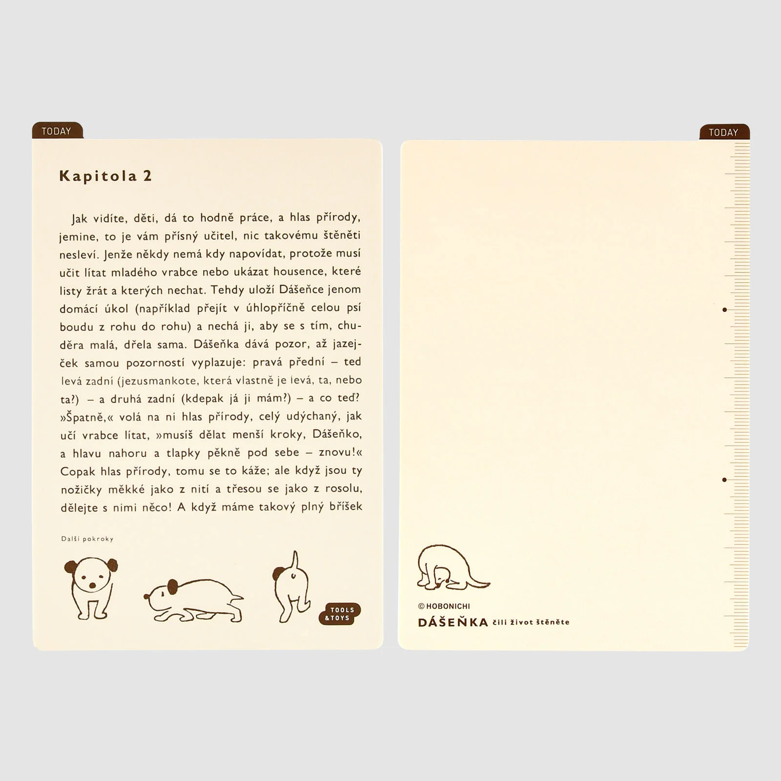 The design is meant to look like a page taken right out of the Czech author Karel Capek’s old illustrated book about the adventures of a puppy, Dashenka: The Story of a Puppy, right down to the cream-colored background and brown print color.