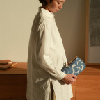 soda water is made from a Jacquard-weave fabric from minä perhonen, who creates all-original garment textiles. The light-gray background is dotted with woven blue circles, but look closely and you’ll see there’s more to this playful, experimental polka-dot design. The dots are not represented as solitary circles, but looking closely at the design, our eyes can see each dot individually. The zipper pull includes a butterfly charm.