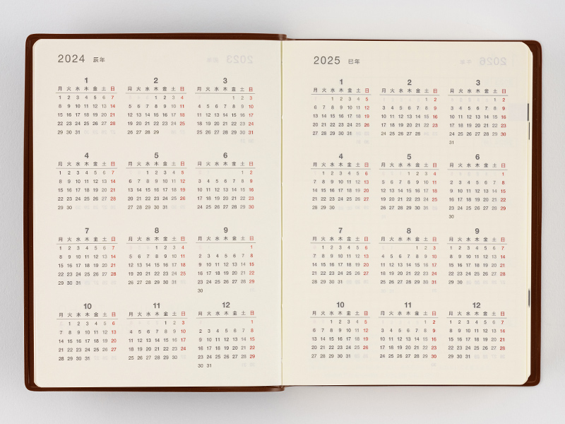 The yearly calendar is the first section in the book. It contains a year per page and spans 5 years. Listed next to the year is the Chinese zodiac animal for that year.