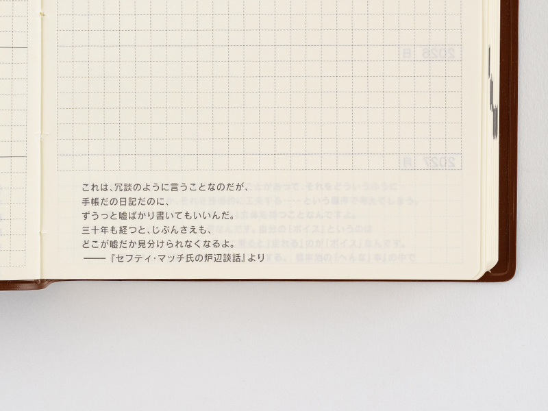 The basic format of the 5-Year Techo has the same date across five years listed on the left side, and a blank graph paper memo page on the right. The layout is flexible enough to allow users to either fill in their pages the same way every day or mix things up as they go.