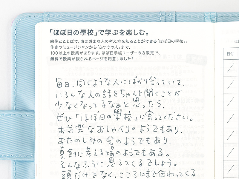 At the online Hobonichi School, you can learn various people’s thoughts and ideas through video and words. We’ve prepared a page exclusively for techo users to access over 100 classes for free to learn from everyone from writers and musicians to everyday people.