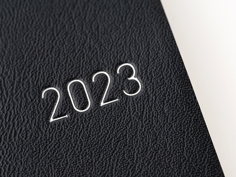 The spine of the Weeks book is embossed with “2023” for easy reference when storing the planner in a bookshelf.