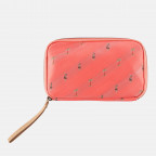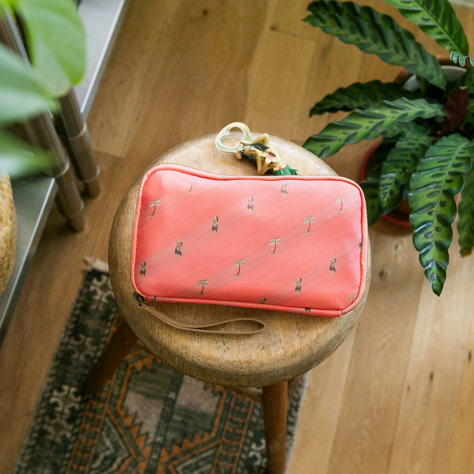 Hula features palm trees and hula girls embroidered on woven necktie material. The background is a gorgeous coral pink, and some of the dancers have their hands raised as they hula dance to the rhythm of the music. The pouch interior is beige.