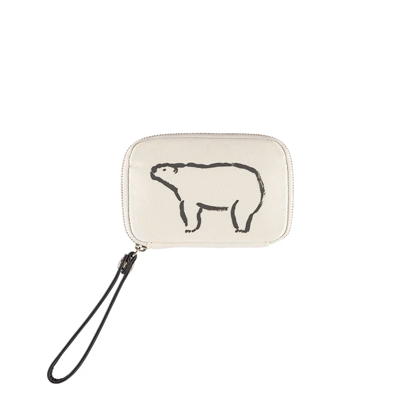 The polar bear cubs doted on by their mother are depicted with thick, soft lineart and given adorable expressions. The back of the pouch has a polar bear splayed out on its belly and relaxing. Just looking at it will give you a gentle feeling inside.