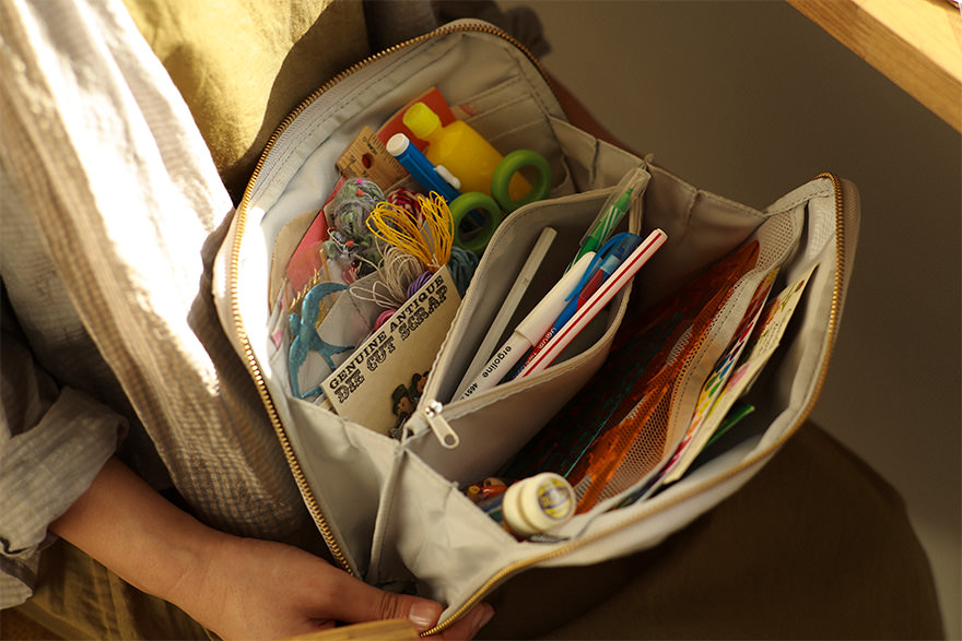 Make a scrapbooking pouch by storing stickers, ribbons, glue, scissors, and all the items you’d want on hand when you’re ready to dive into your favorite hobby.
