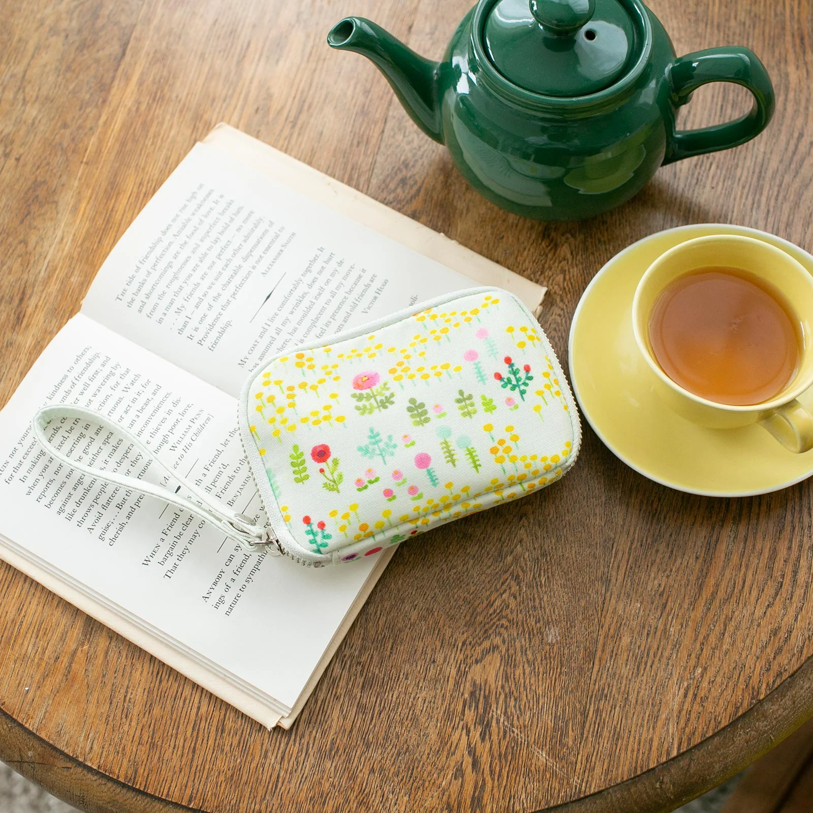 This printed fabric was illustrated by Aki Kondo, who is famous for creating picture books, coming up with the concept for Rilakkuma, and creating the characters Mofy the rabbit, woo and wah, and Ofuton-san. There’s a soft, mint blue background and a host of yellow and red flowers painted in watercolor to cheer you up. The interior is a vivid pink.