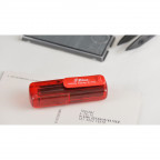 The self-inking stamp has a lever that pops it open to expose the surface of the message for stamping. The ink pad is attached to the stamp itself, causing the ink pad to reapply the black ink to the stamp in its closed position. The unit fits in the palm of your hand for easy portability.