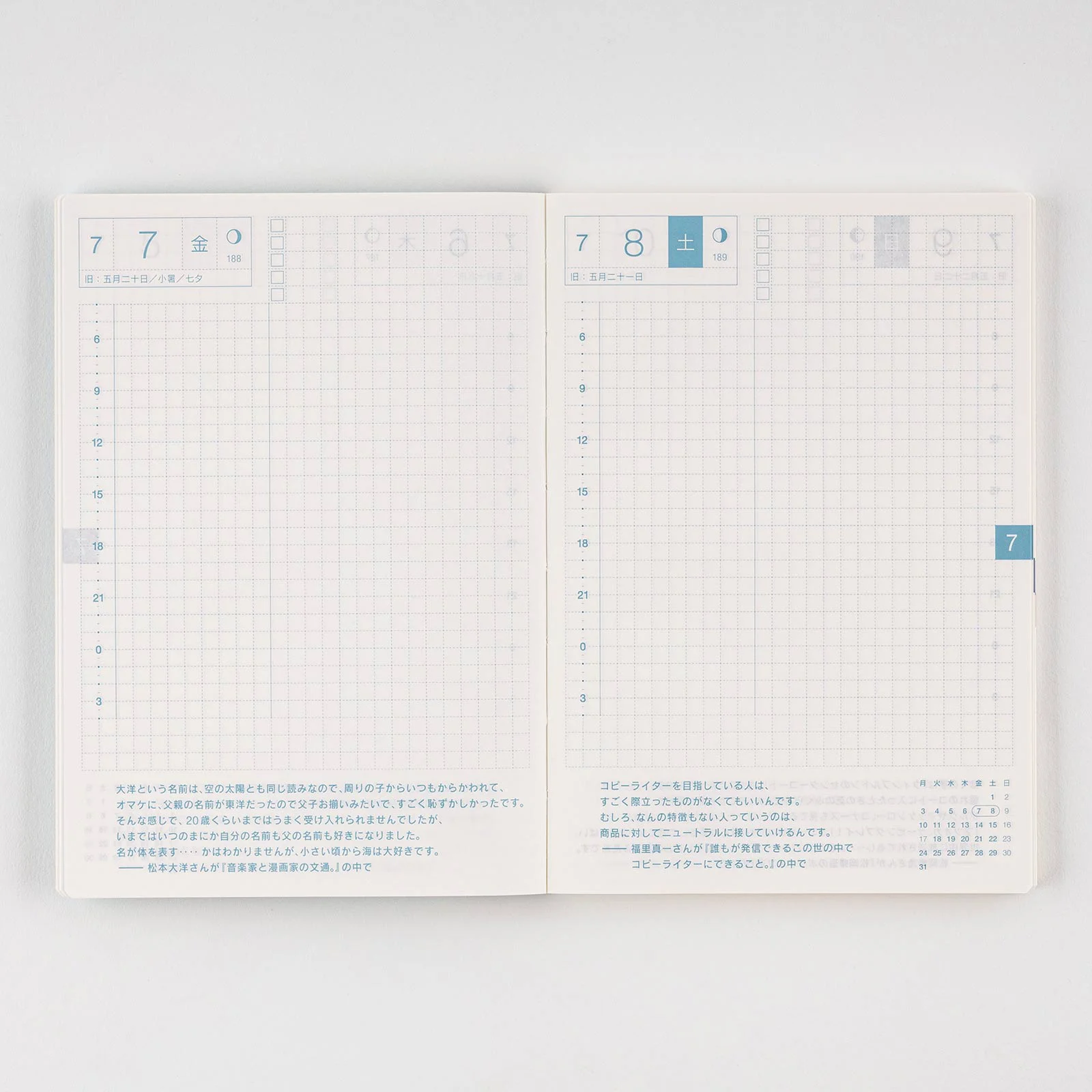 The Avec version splits the A6 Hobonichi Techo Original, design and all, into books of six months each with only slight variances in calendar spans and the number of extra pages in the back. This allows you to fill the pages to your heart’s content with scheduling, diaries, little notes, tickets, photographs, doodles, and anything that strikes your fancy.