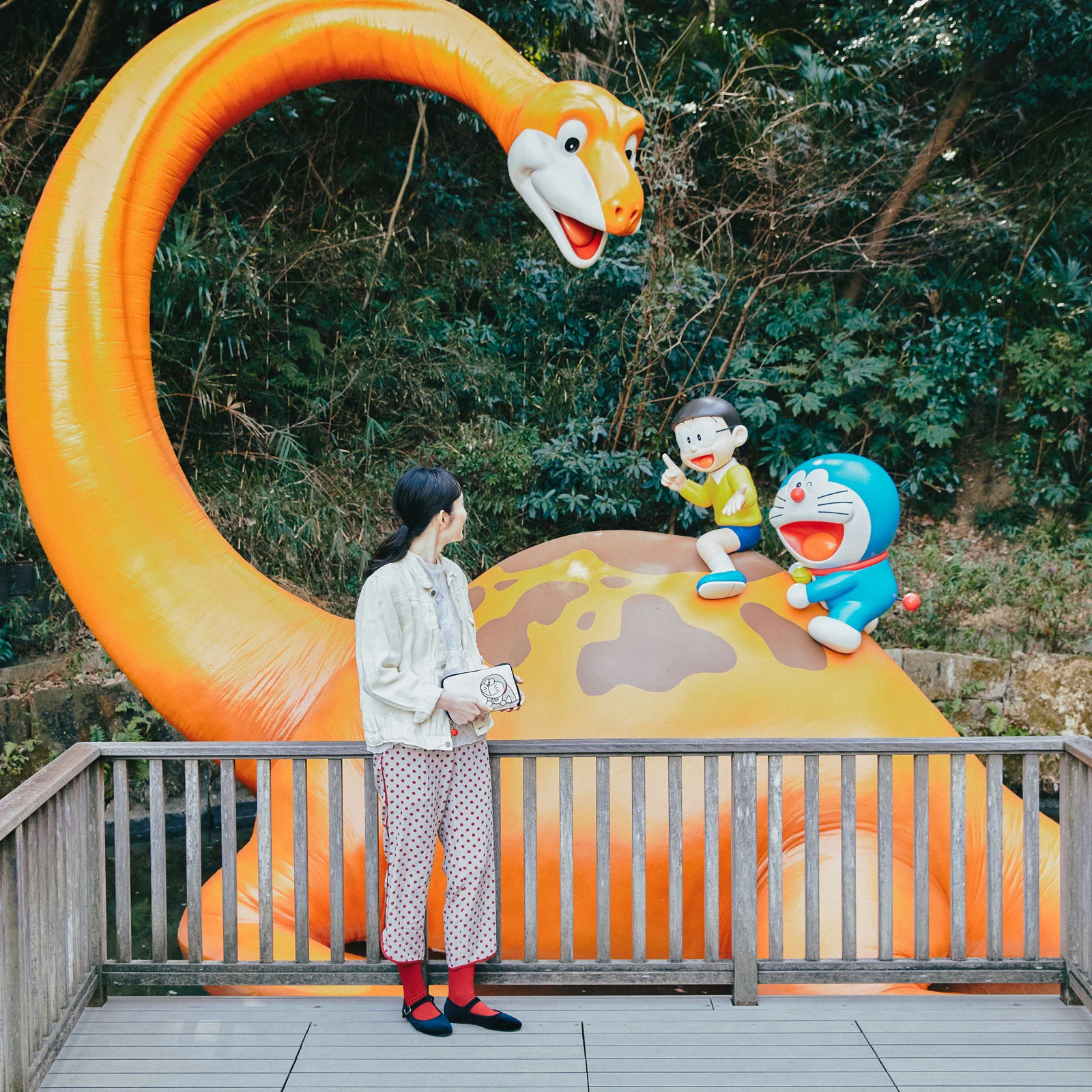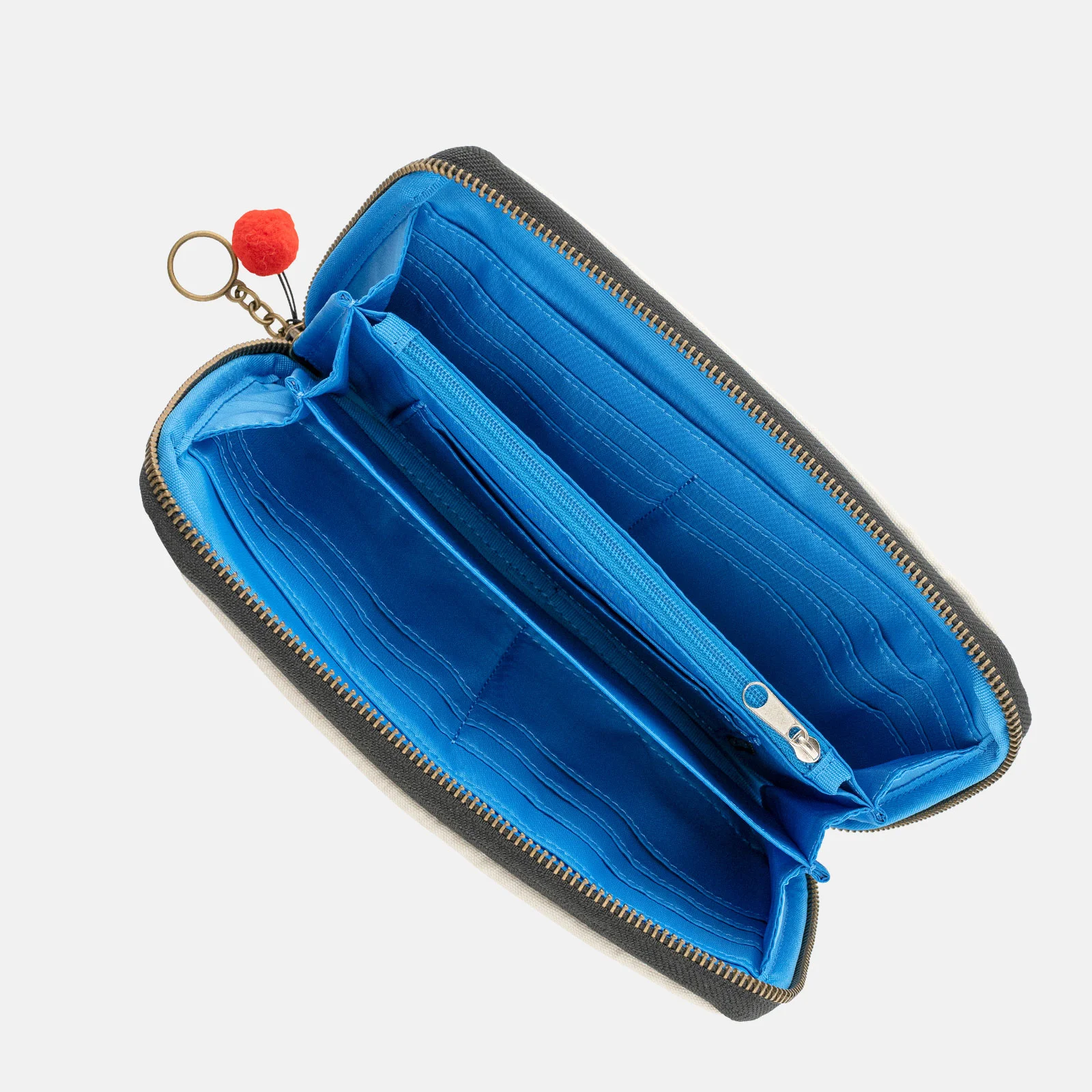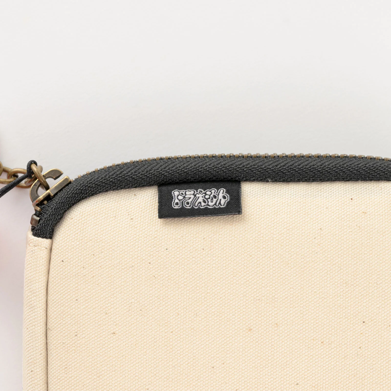 The outside uses a simple ecru canvas material, but open the pouch to reveal vivid Doraemon-like colors. The zipper pull is a round charm, just like Doraemon’s tail. The black tag with the words “Doraemon” printed in white adds an accent to the look.
