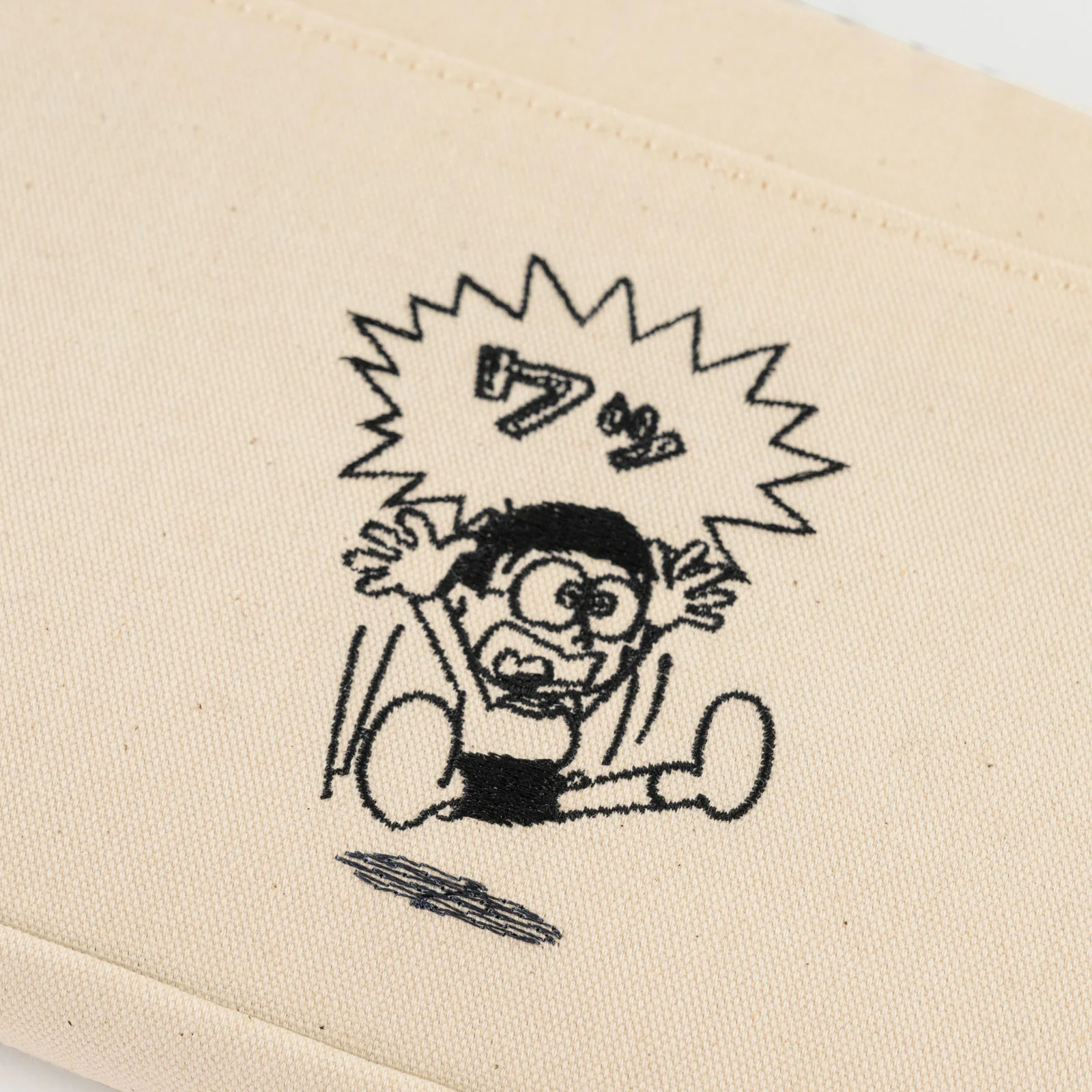 Doraemon rides on a time machine from the 22nd century and saves Nobita with various secret tools pulled out from his “4D pocket.” This pouch depicts the scene in the manga where Doraemon appears for the very first time using embroidery. The color scheme uses black and white, creating a chic look. This scene of Doraemon coming out of a desk “drawer” and Nobita jumping up in surprise is perfect for the “Drawer” Pouch.