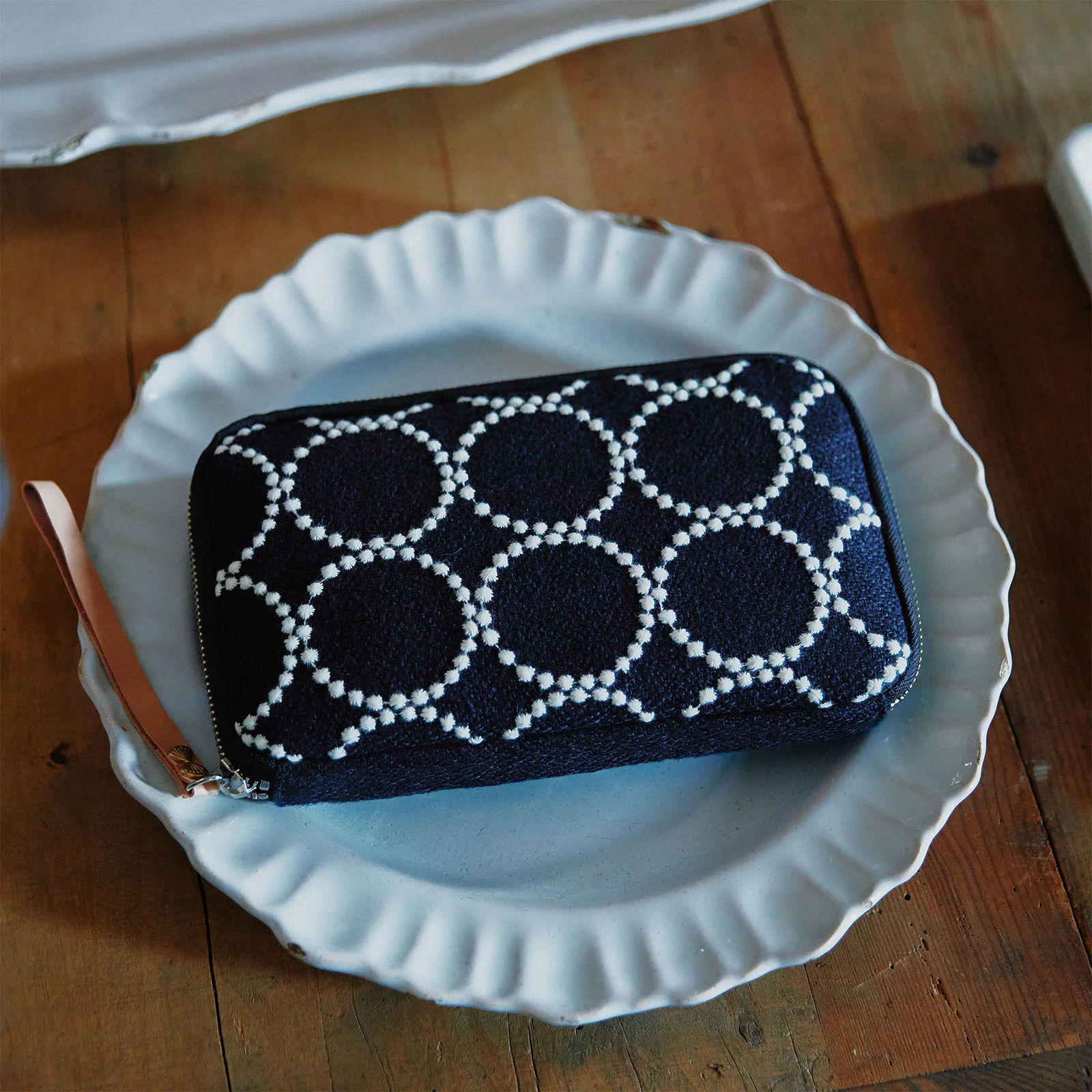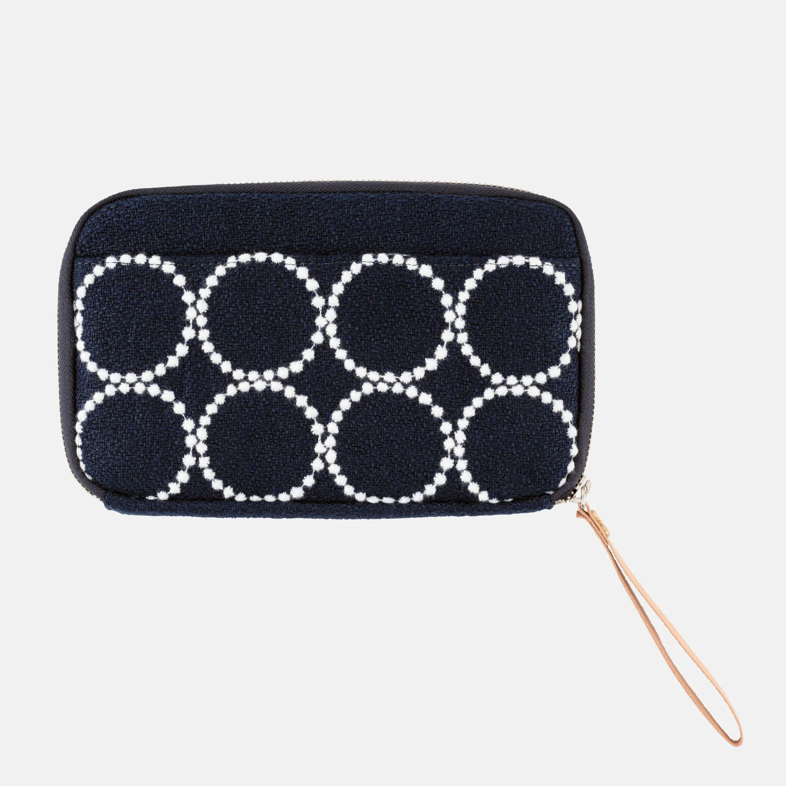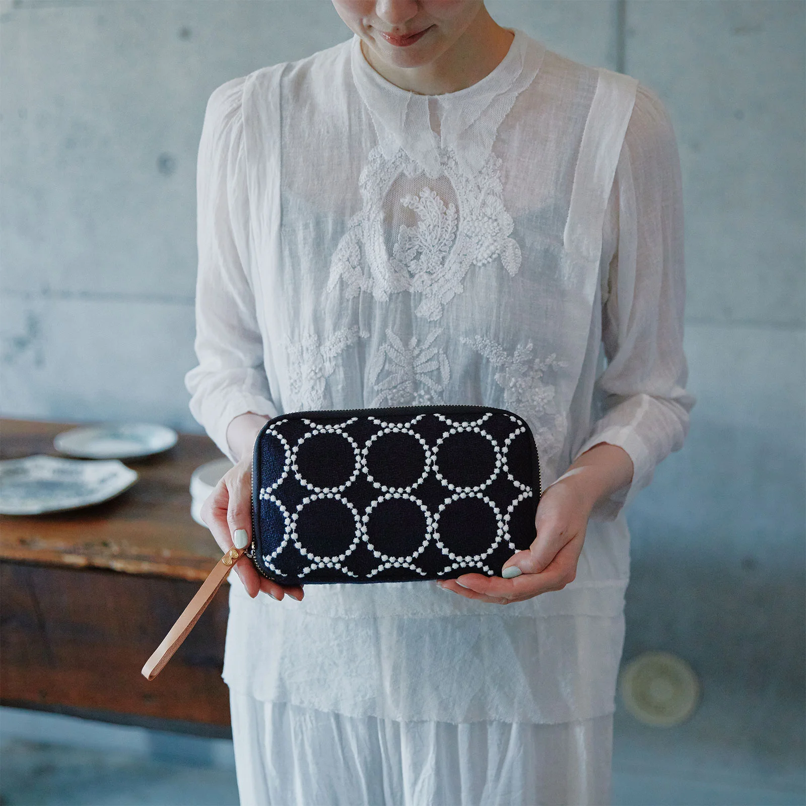 The base fabric is a linen georgette, which has both a fine luster and a woven texture. Slightly thicker threads are roughly woven to create a supple texture. The color is a combination of navy and white, and the pouch interior is navy as well.
