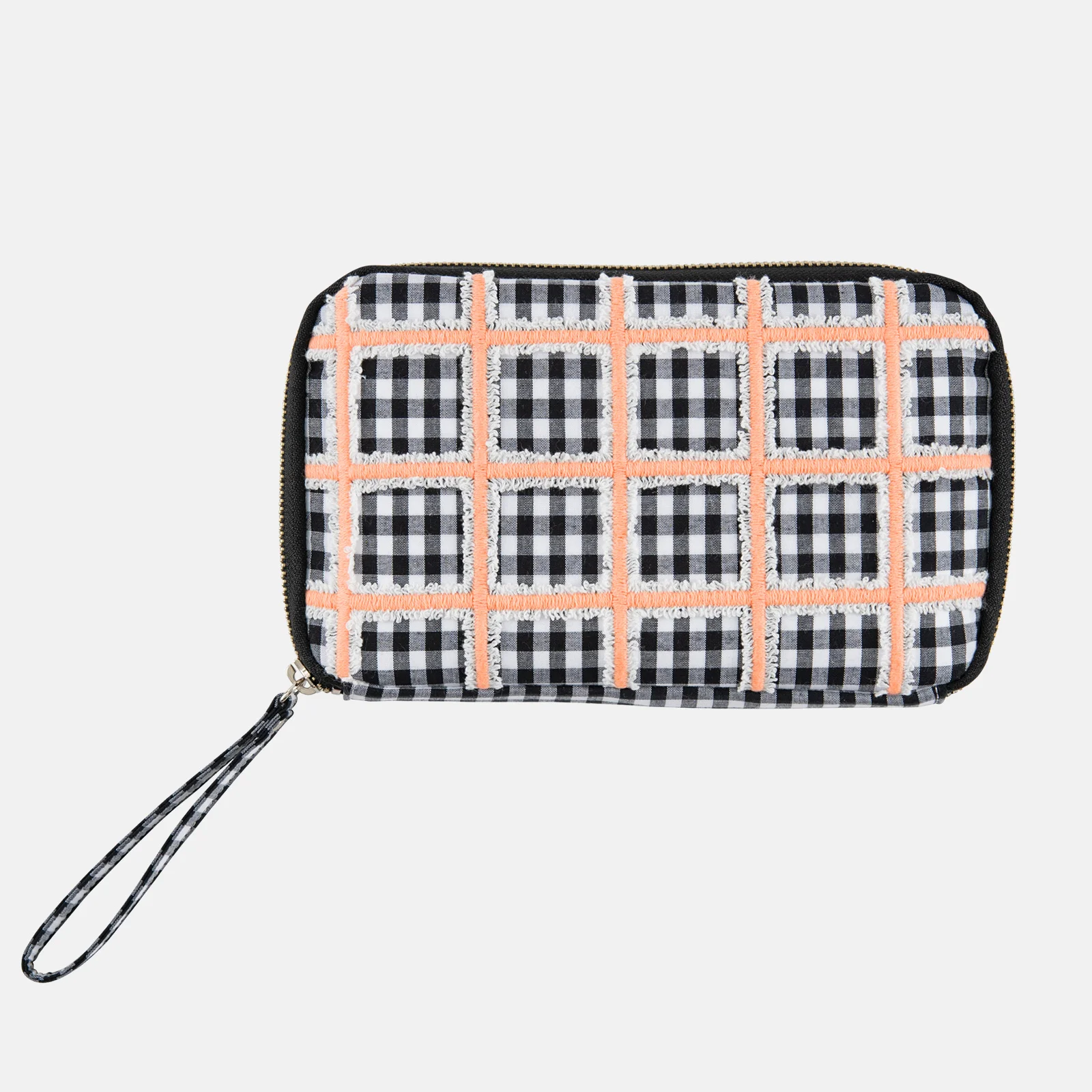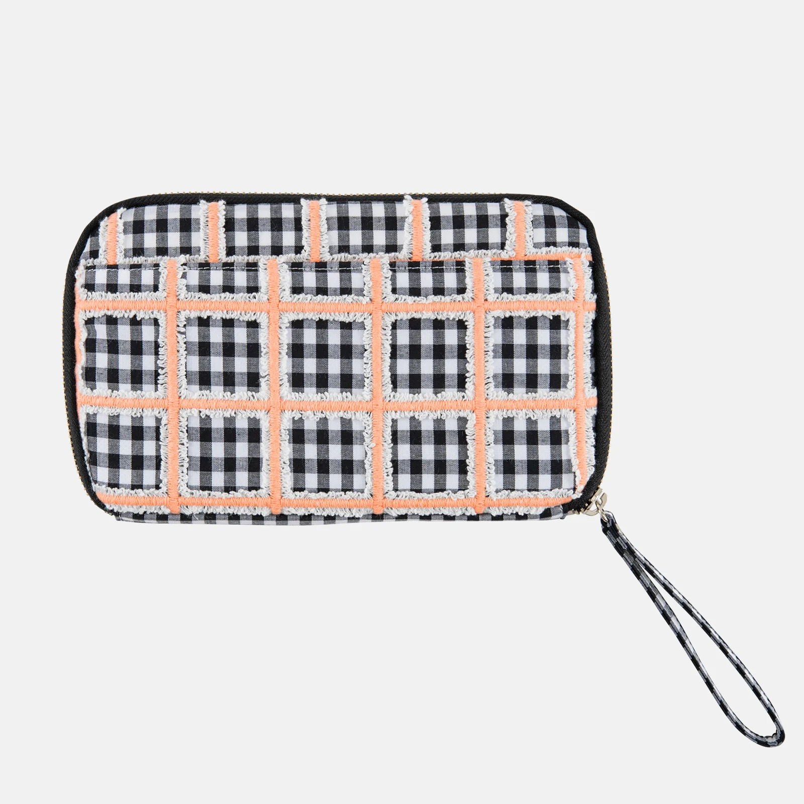 POTTENBURN TOHKII is brand that explores the mysteries and questions of everyday life. Their clothing is made with eye-catching, textured fabrics. Pink Block is built atop a basic gingham design, overlaid with white grid fringe and a top layer of embroidery in a pink, checkered pattern. Neatly sewing together three separate grid patterns is a complex procedure, with meticulous adjustments required for every single part of the process; the textile requires a great deal of time and labor. The result is a charming checkered pattern that exudes a sense of chic sweetness. The interior is a charcoal gray.