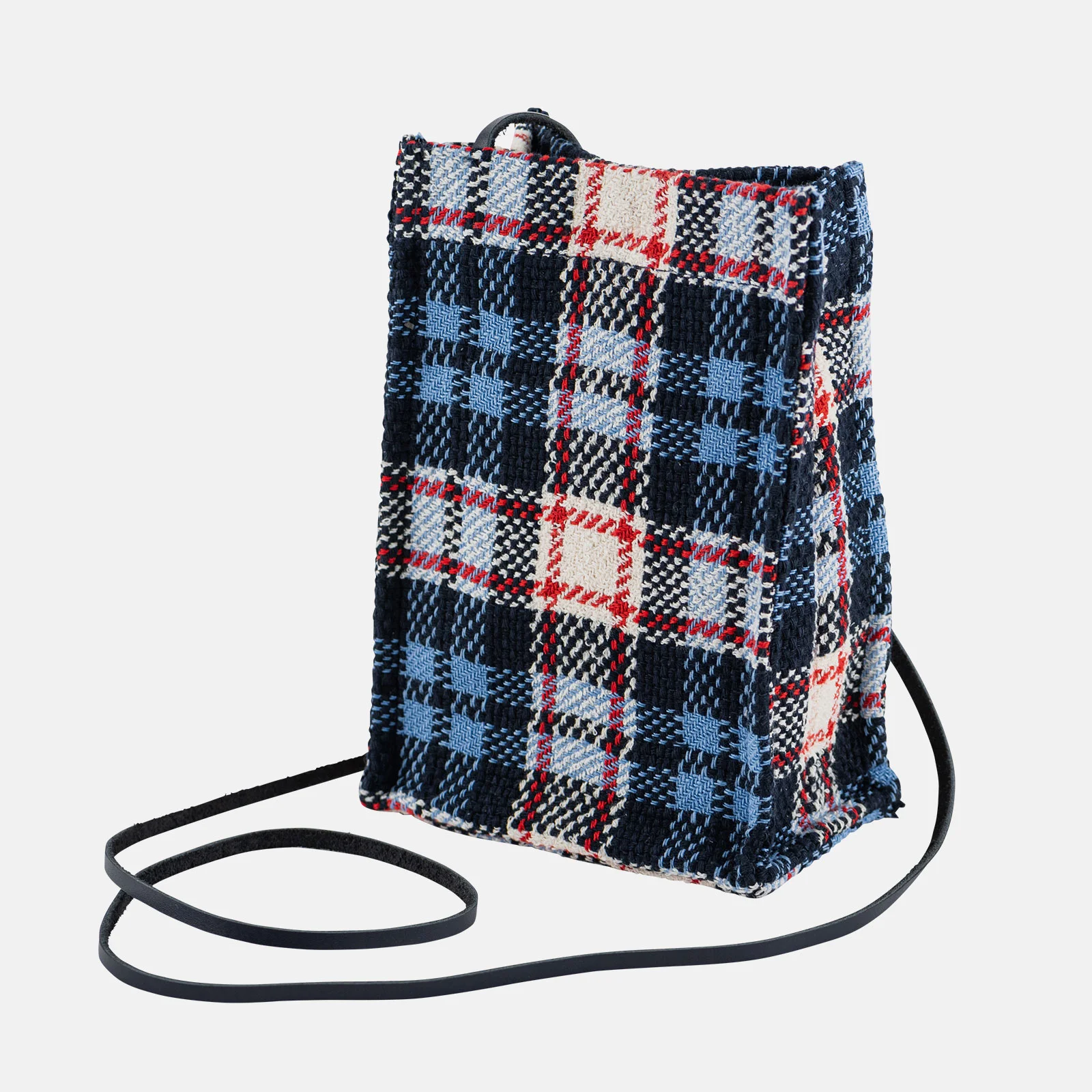 Marine Tweed adds a tri-colored plaid pattern that’s accented by red on a fresh blue and white base. This expressive textile is made by weaving in threads that are made by intertwining multiple threads, and those that have texture. Because the threads are woven slowly with care not to apply pressure, the material retains air and keeps a soft, pleasant fluff. The interior is white and has a navy leather shoulder strap.