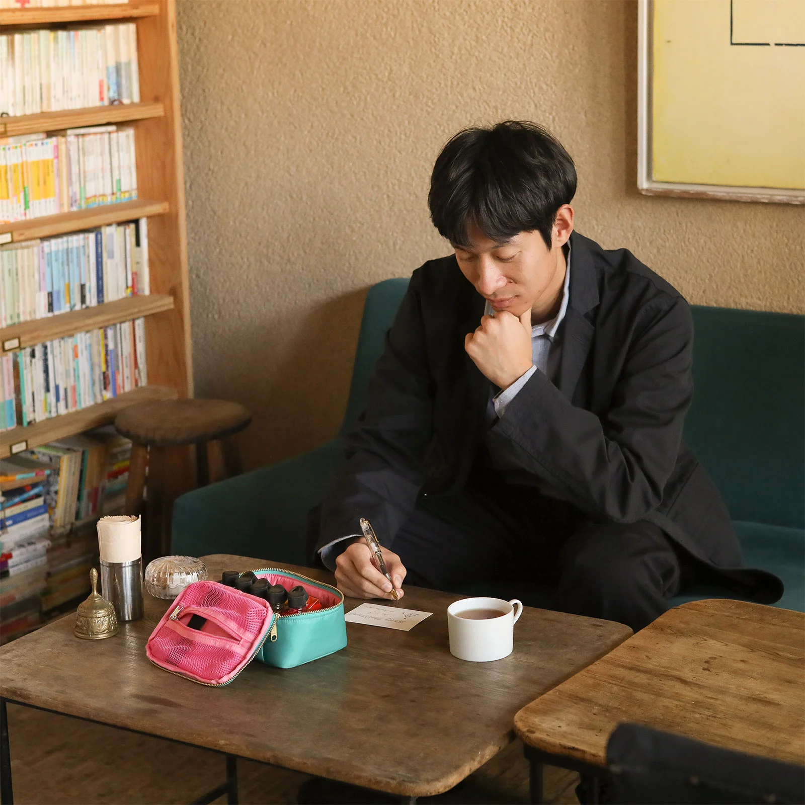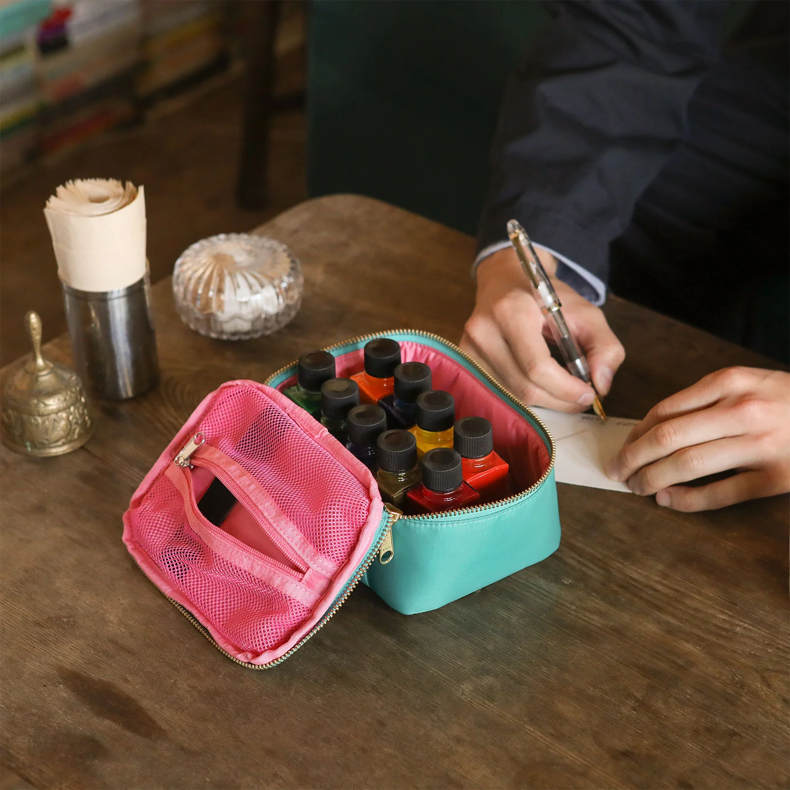 Organize bottles of fountain pen inks. You can enjoy writing by hand wherever you go. (Pictured: Lotus)