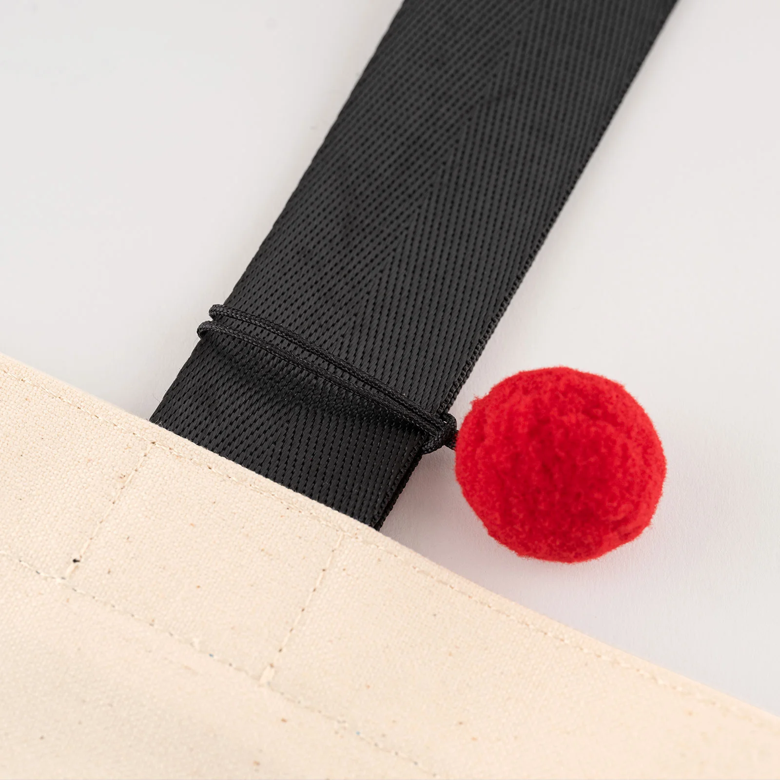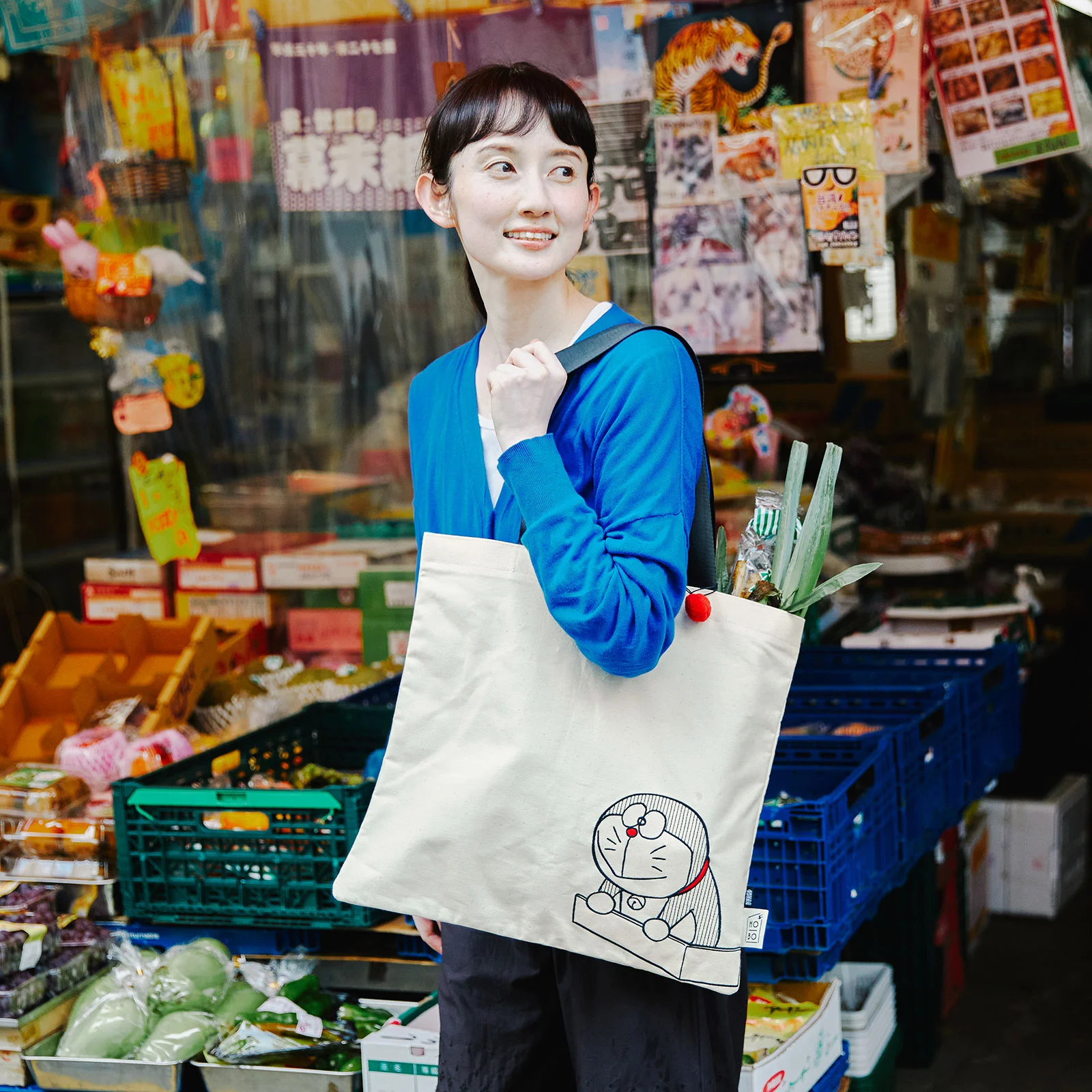 The outside uses a simple ecru canvas material, but open the bag to reveal vivid Doraemon-like colors. The handle is a black nylon belt that’s thick enough to hold comfortably or easily drape over your shoulder. The bag also contains a round charm to evoke Doraemon’s tail. Attached to the bag is a black tag with the logo “Doraemon” in white for a nice accent.