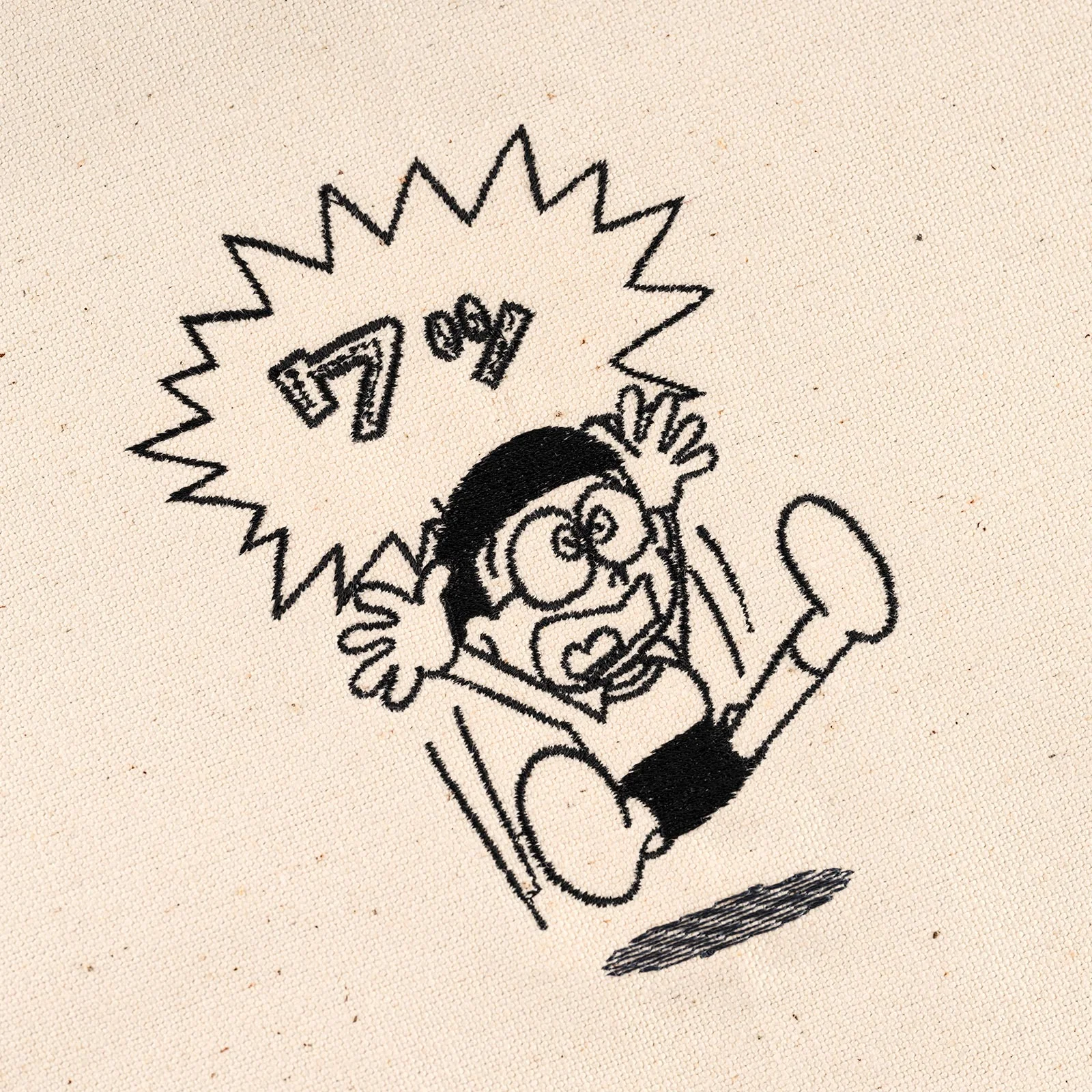 Doraemon rides on a time machine from the 22nd century and saves Nobita with various secret tools pulled out from his “4D pocket.” This tote bag uses embroidery to depict the scene in the manga where Doraemon appears for the very first time. The color scheme uses black and white, creating a chic look.