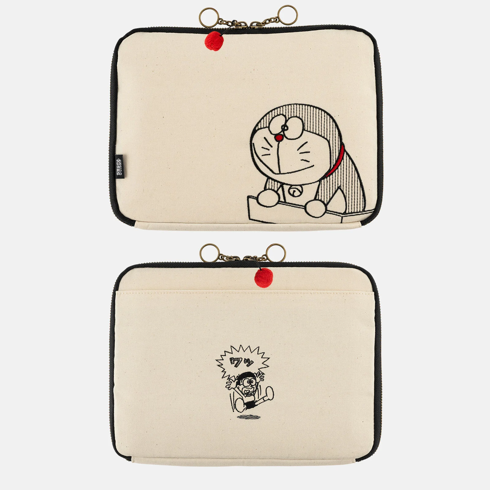 The outside uses a simple ecru canvas material, but open the pouch to reveal vivid Doraemon-like colors. The zipper pull is a round charm, just like Doraemon’s tail. The black tag with the words “Doraemon” printed in white adds an accent to the look.