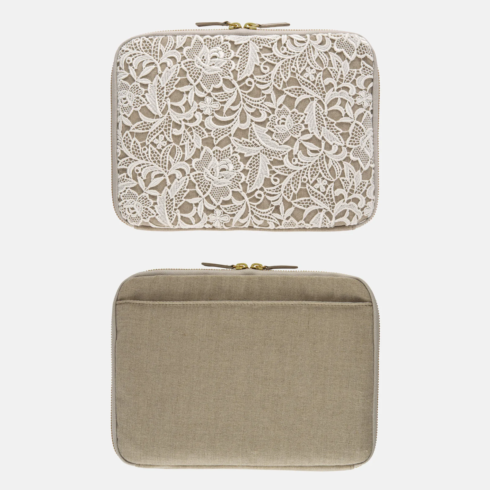 Flower Lace’s linen base is overlaid with intricate, textured lace. The elegant lace, filled with blooming flowers, was created by a lace maker with over 80 years of history.
