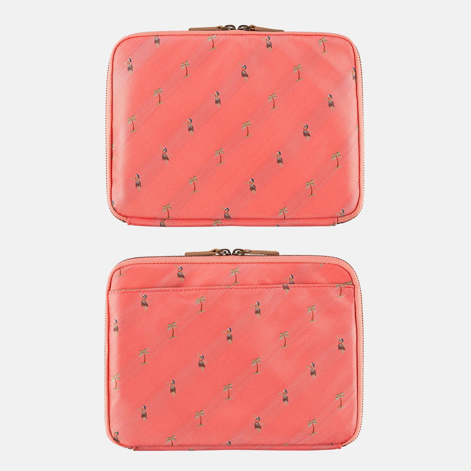Hula features palm trees and hula girls embroidered on woven necktie material. The background is a gorgeous coral pink, and some of the dancers have their hands raised as they hula dance to the rhythm of the music. The pouch interior is beige.
