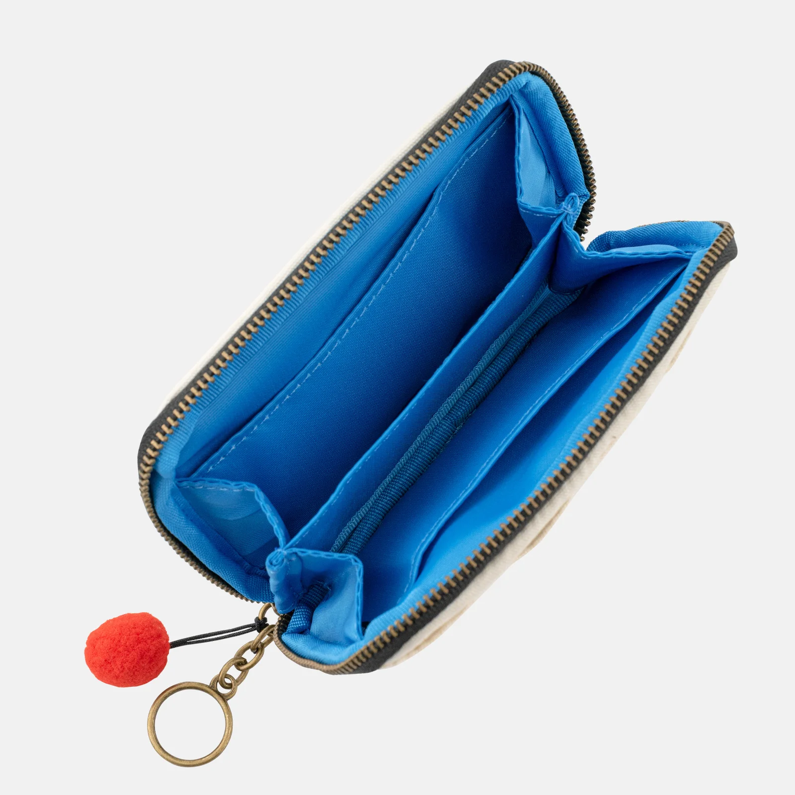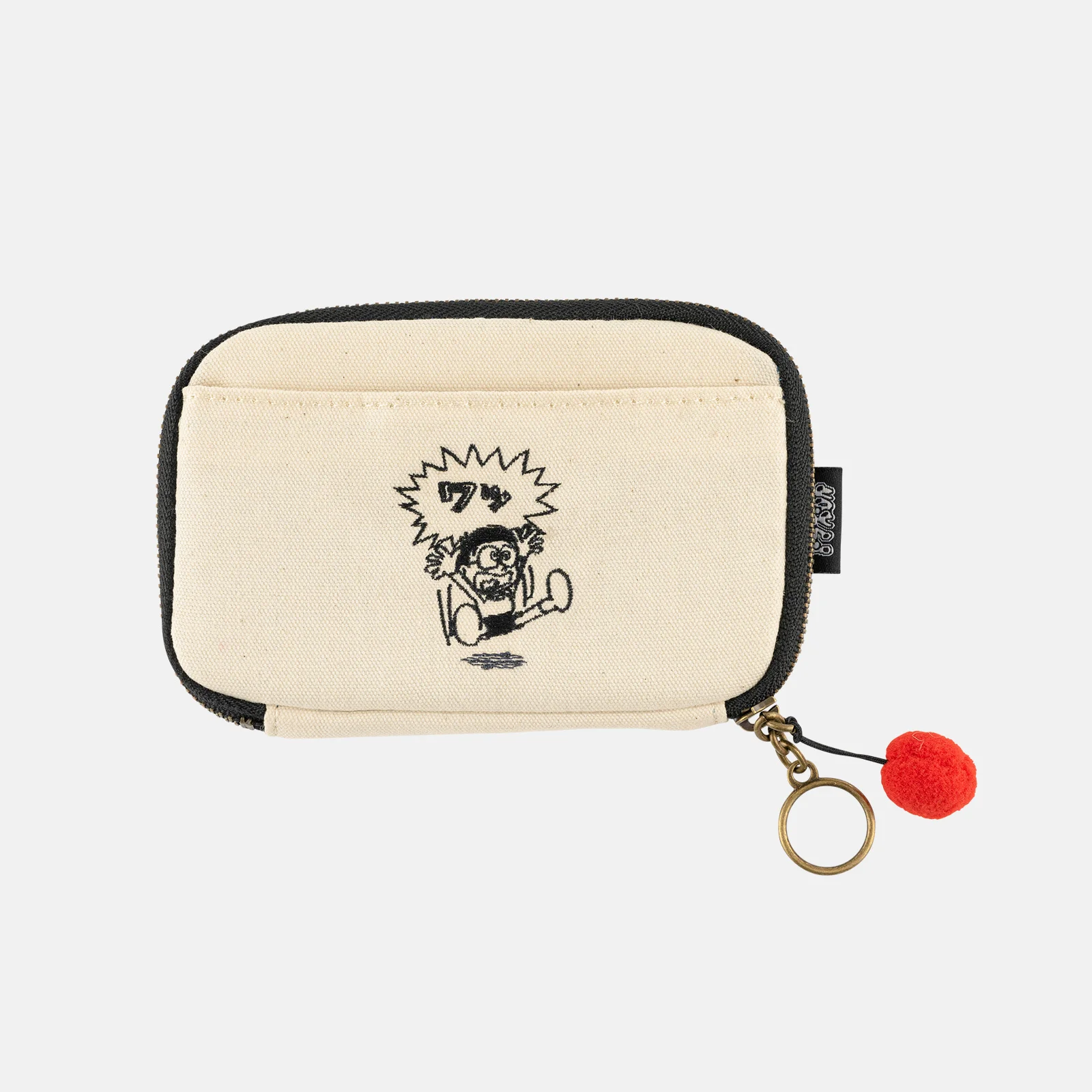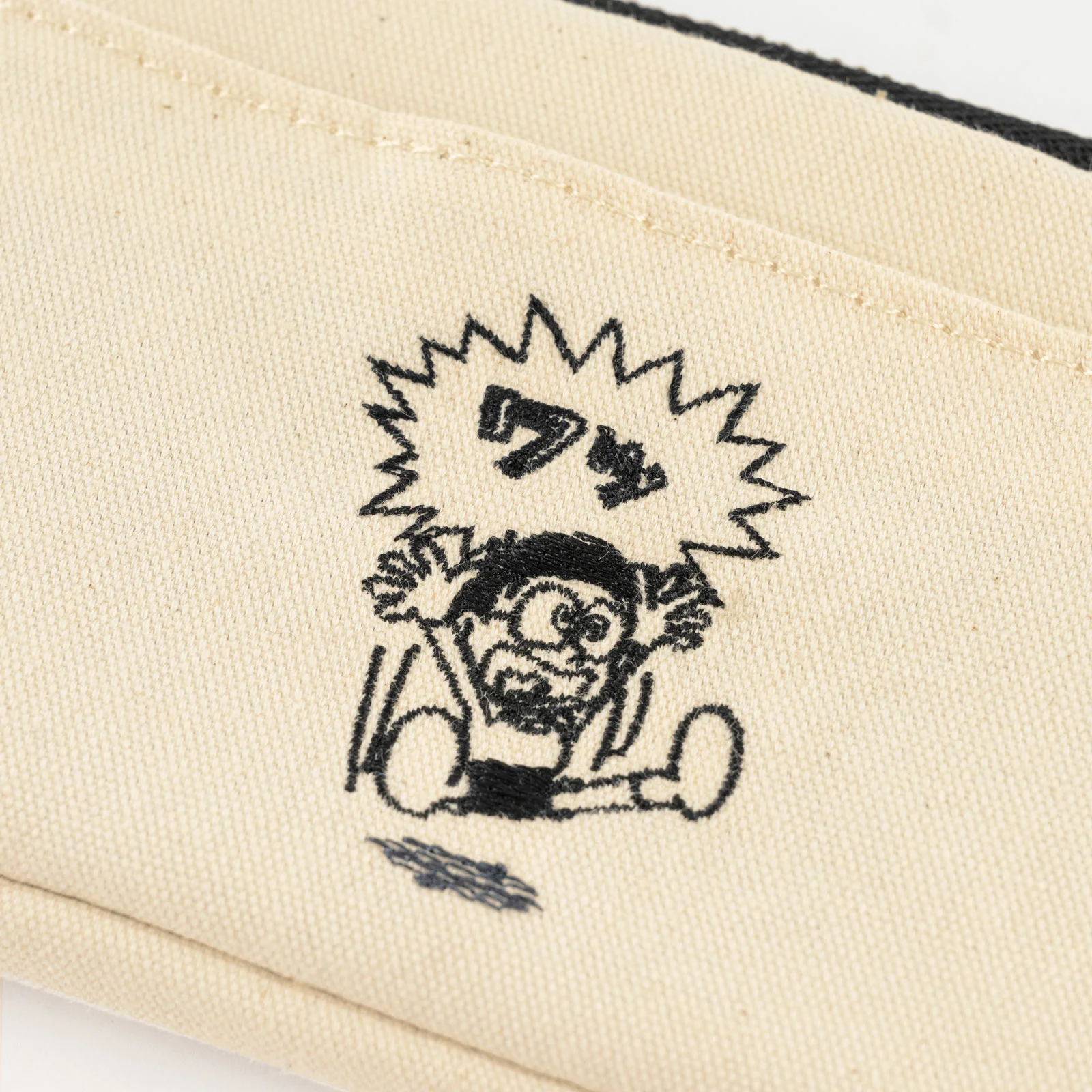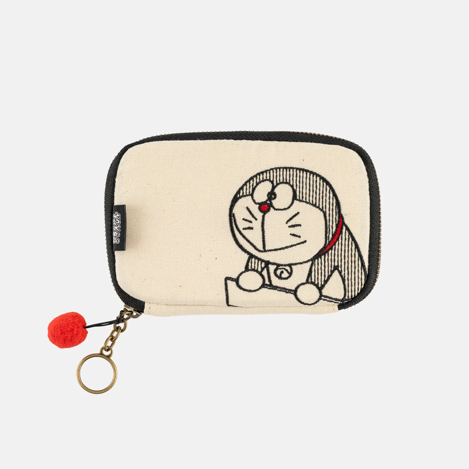 The outside uses a simple ecru canvas material, but open the pouch to reveal vivid Doraemon-like colors. The zipper pull is a round charm, just like Doraemon’s tail. The black tag with the words “Doraemon” printed in white adds an accent to the look.
