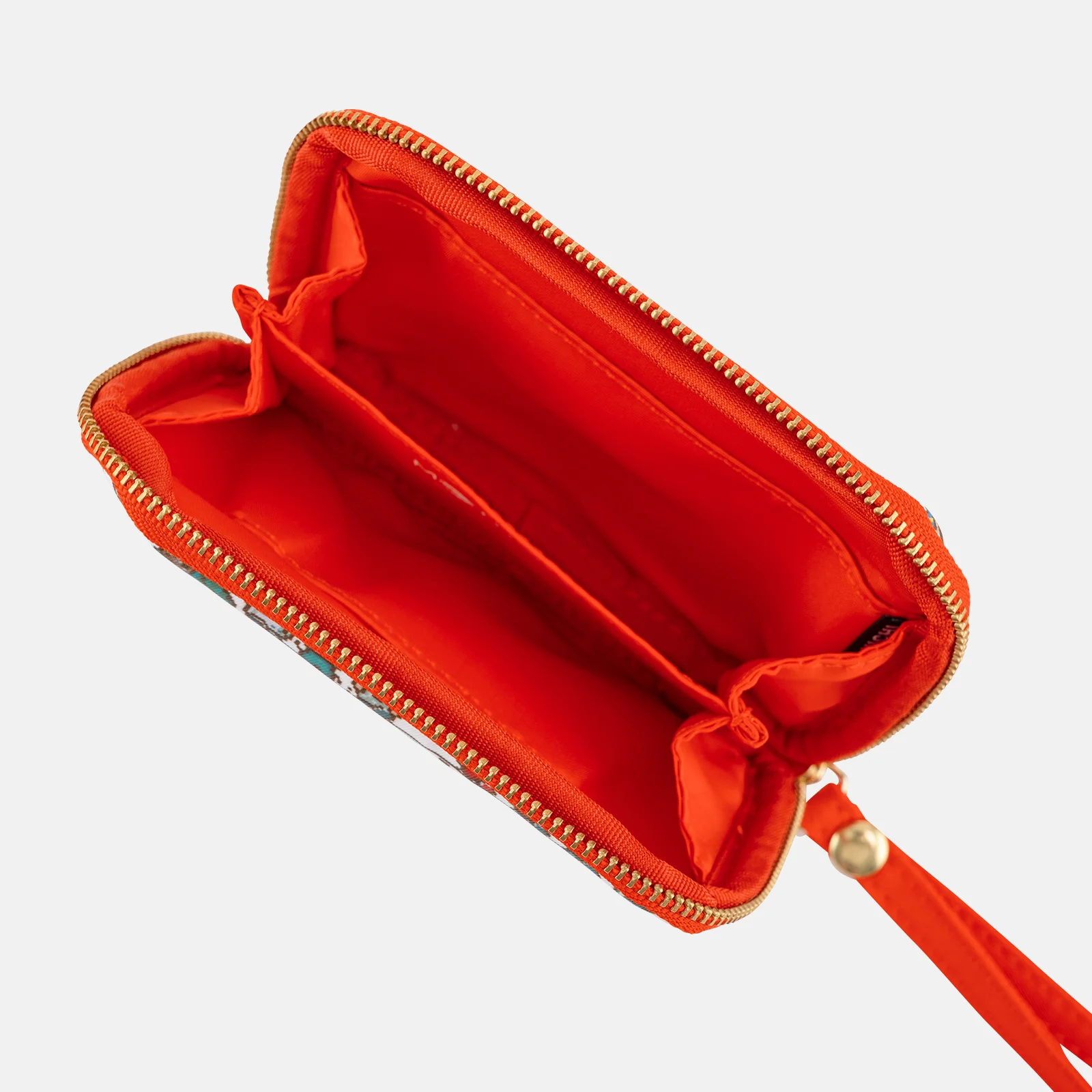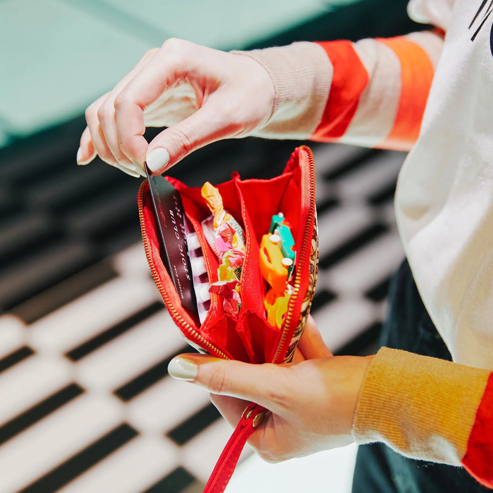 The pouch opens accordian-style and is the perfect size for storing cards. The interior is split into four zones to allow for detailed organization. While compact, the pouch also has enough storage space to hold items with volume, such as lip balm and earbuds.
