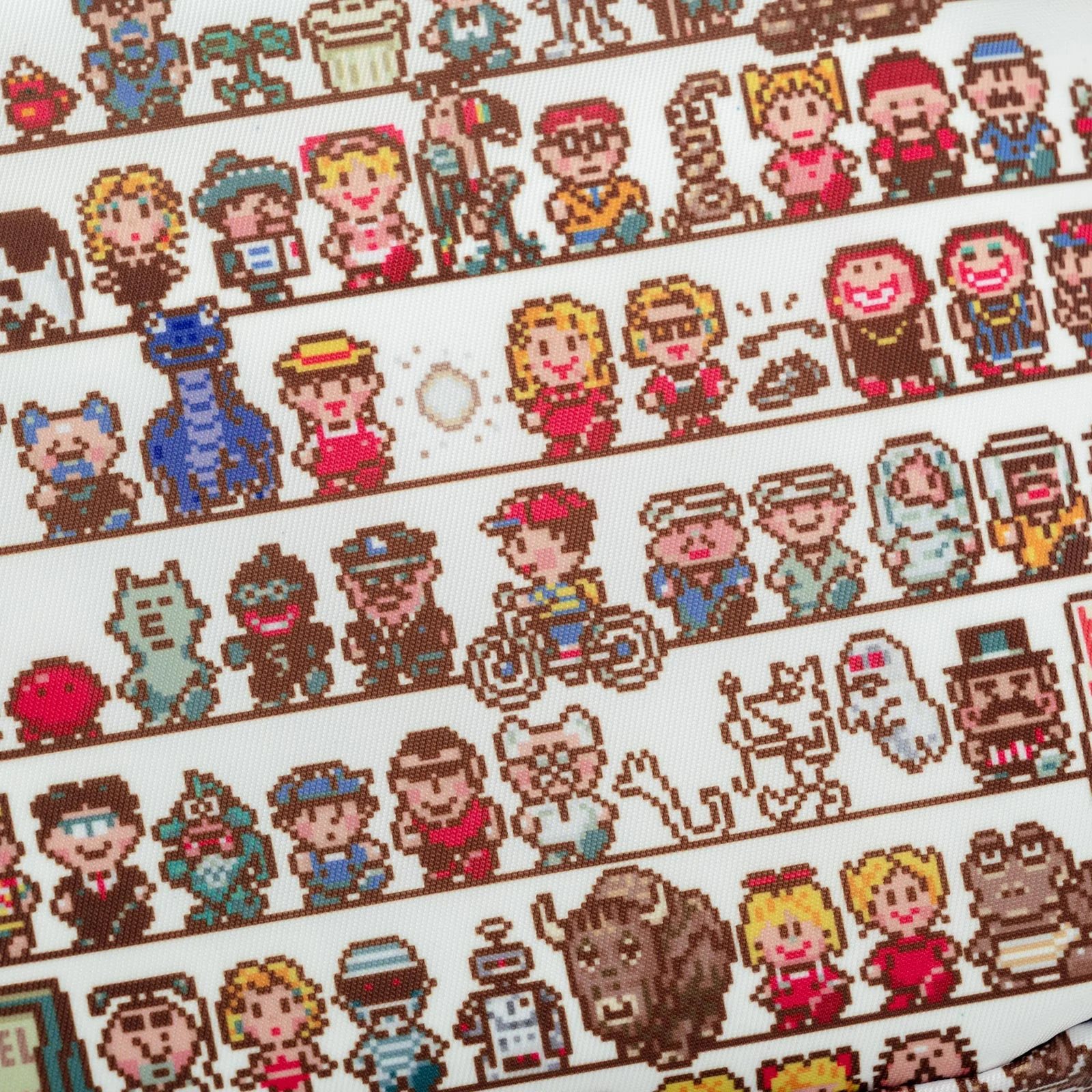 The Cast design features a wide array of characters that appear throughout Shigesato Itoi's 1994 Super Nintendo game, MOTHER 2 (EarthBound in North America). The lineup includes not only the main characters, but also many beloved side characters, making it fun to look through and find all your favorite NPCs while reminiscing on scenes from the game. You can even spot some sprites that were exclusive to the Japanese version before being edited during localization. The pouch interior is a vibrant red, and the inner pocket includes a striking image of the lovely MOTHER 2 logo.