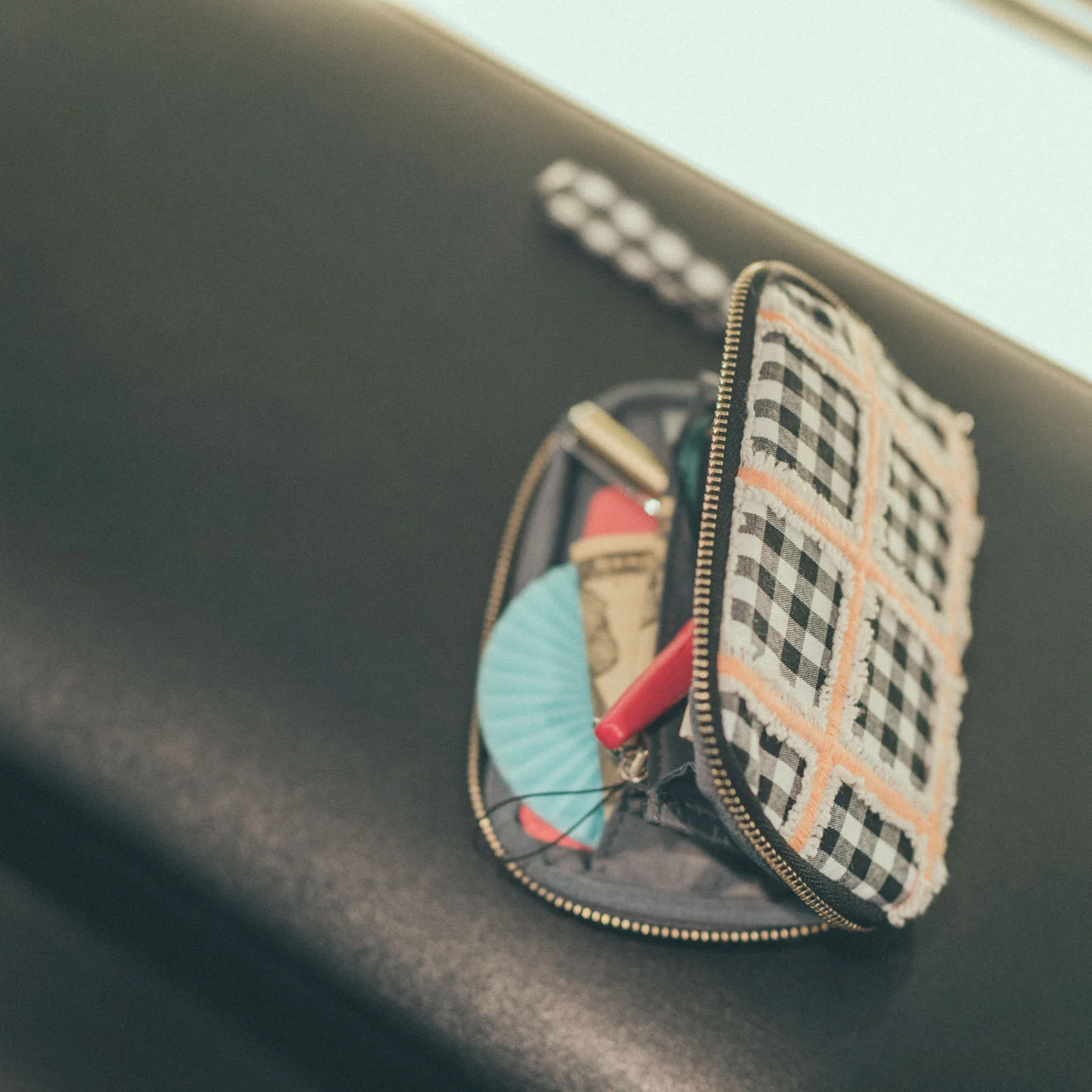 POTTENBURN TOHKII is brand that explores the mysteries and questions of everyday life. Their clothing is made with eye-catching, textured fabrics. Pink Block is built atop a basic gingham design, overlaid with white grid fringe and a top layer of embroidery in a pink, checkered pattern. Neatly sewing together three separate grid patterns is a complex procedure, with meticulous adjustments required for every single part of the process; the textile requires a great deal of time and labor. The result is a charming checkered pattern that exudes a sense of chic sweetness. The interior is a charcoal gray.
