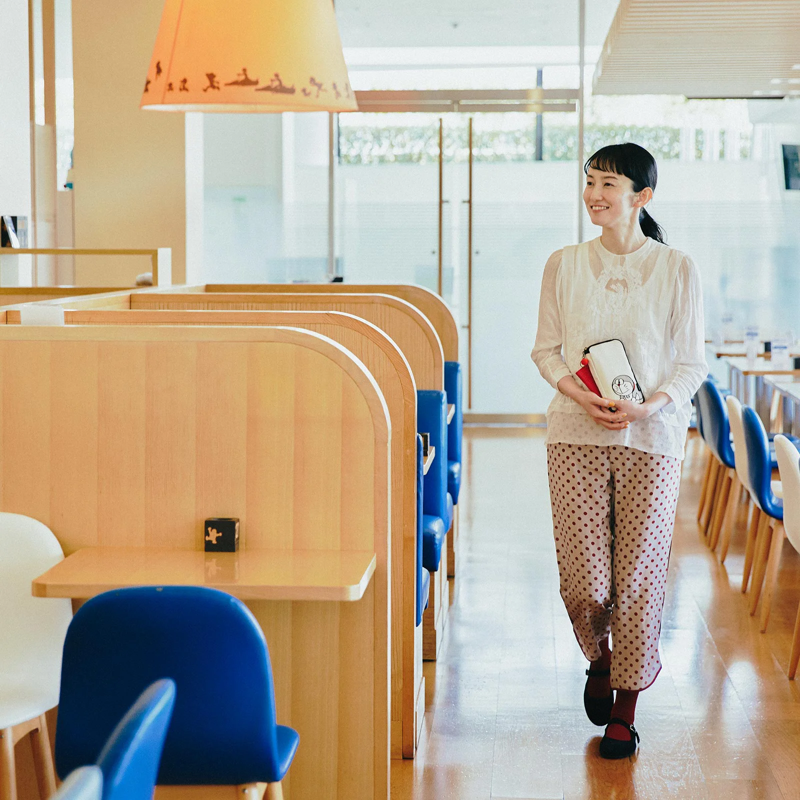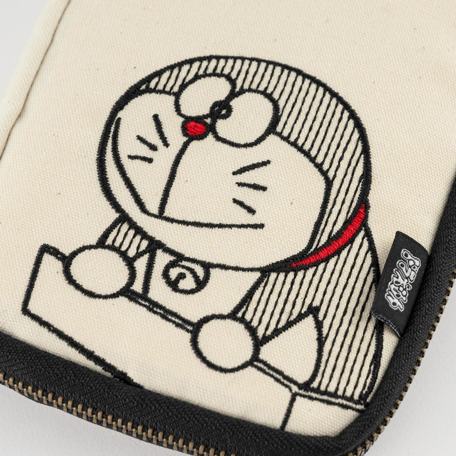 The outside uses a simple ecru canvas material, but open the pouch to reveal vivid Doraemon-like colors. The zipper pull is a round charm, just like Doraemon’s tail. The black tag with the words “Doraemon” printed in white adds an accent to the look.