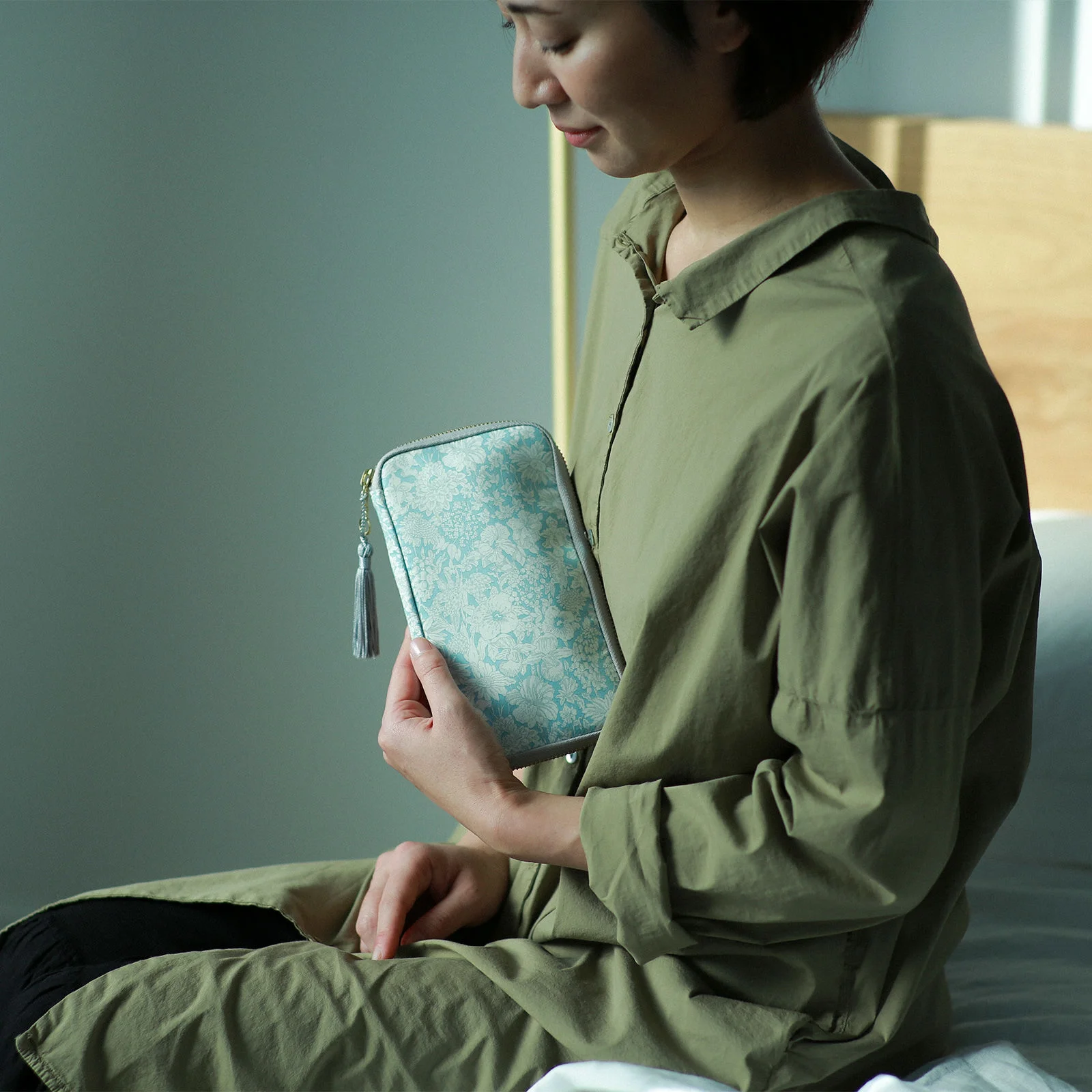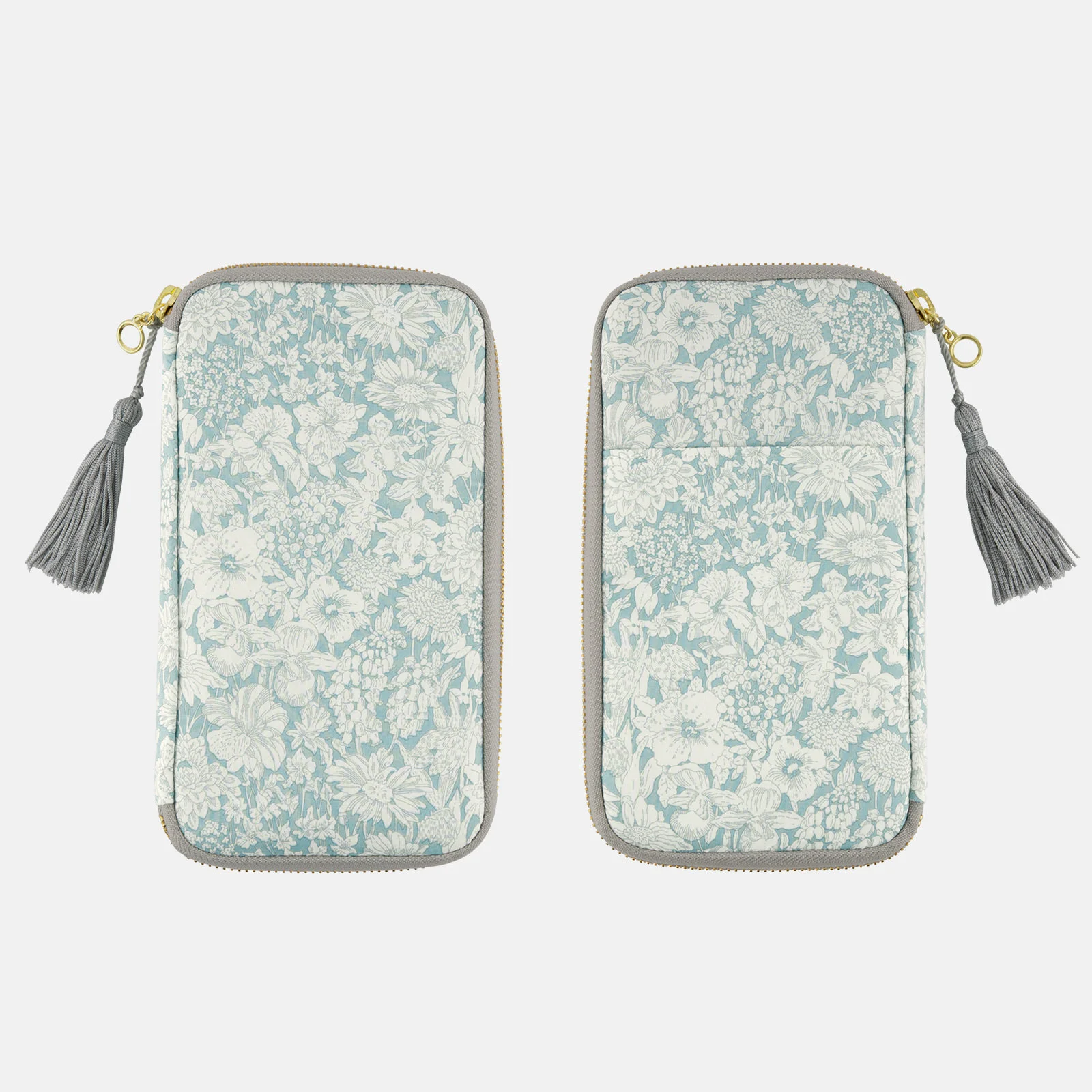 This pouch’s delicate and beautiful floral design ornaments a textile from the venerable brand Liberty London Fabrics. The beautiful light blue material is printed with an array of flowers, including Japanese iris, gerbera daisy, sunflower, and bluebells. The zipper pull includes a shiny gray tassel.