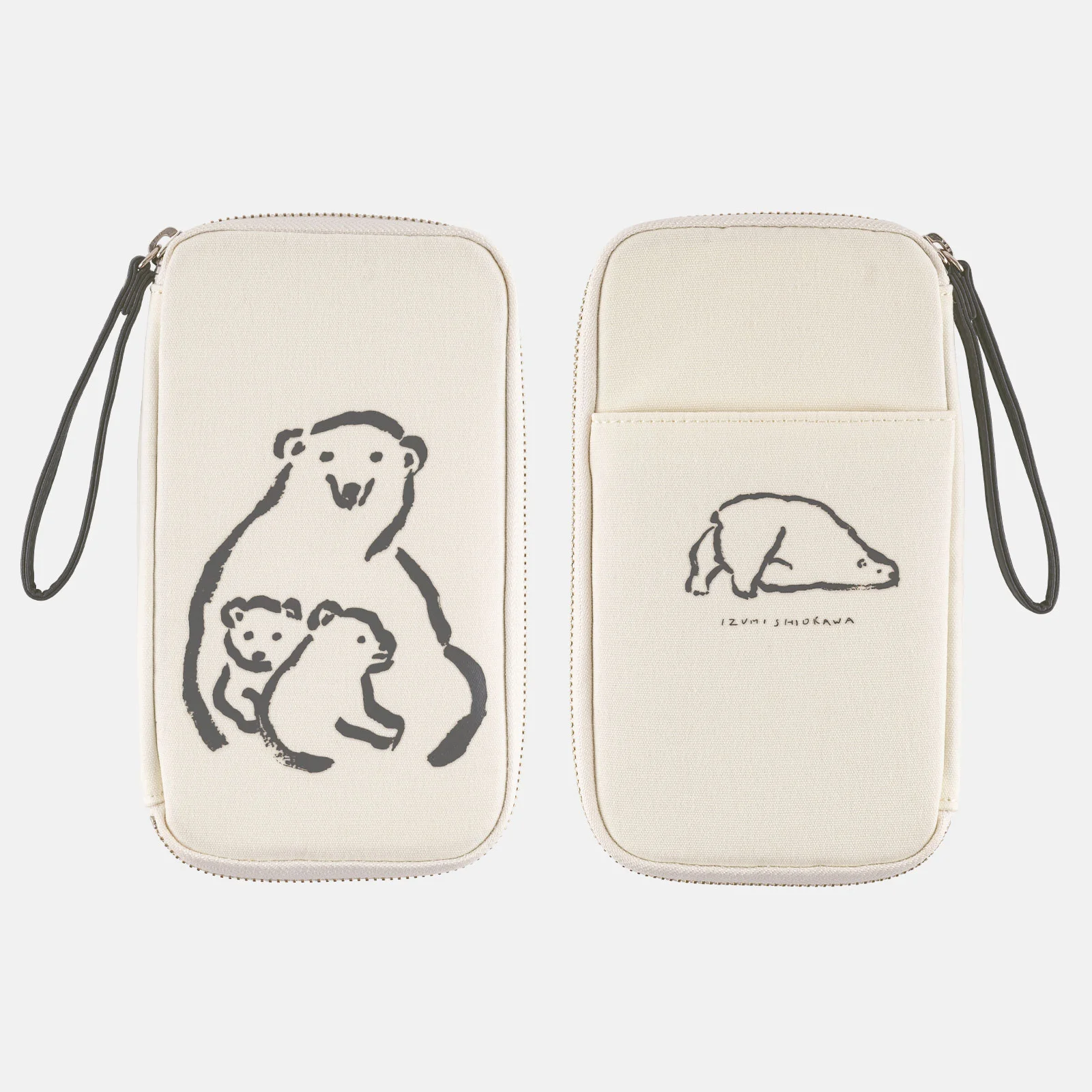 The polar bear cubs doted on by their mother are depicted with thick, soft lineart and given adorable expressions. The back of the pouch has a polar bear splayed out on its belly and relaxing. Just looking at it will give you a gentle feeling inside.