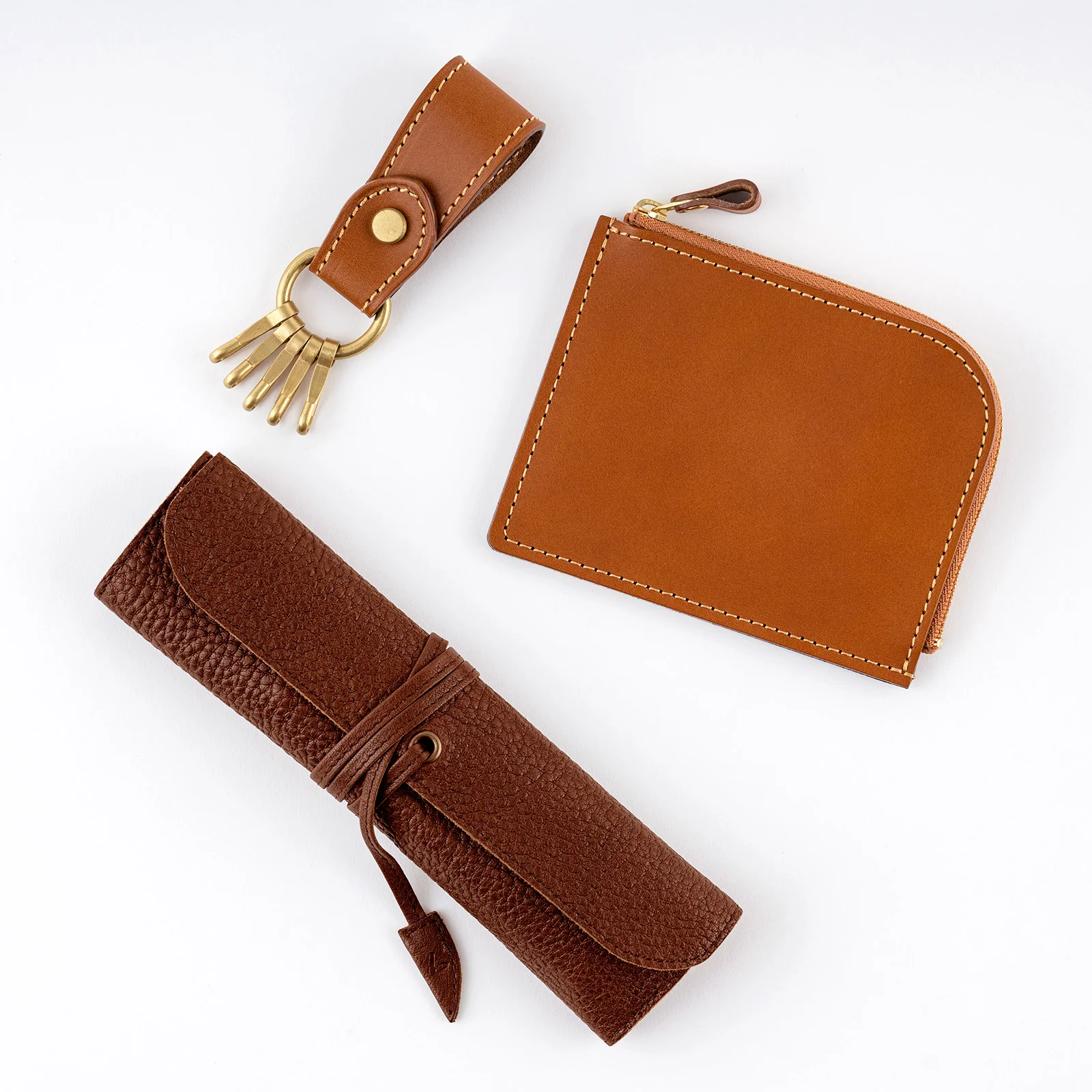 This compact, natural leather wallet allows you to fully enjoy the appeal of leather. The zipper runs along an L-shape of the wallet so you can open the wallet wide and easily access the contents. The large pocket can store coins, and the two areas separated by this pocket can store cards and currency. The longer you use it, the deeper the color and shine become. The leather’s color is a light brown.