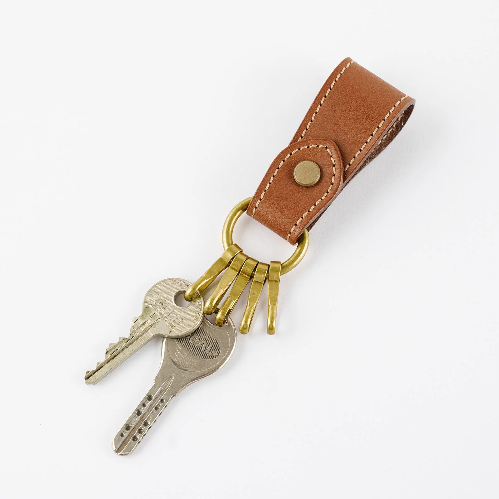 This wide and thick strip of leather has been turned into a sturdy keychain. The longer you use it, the softer the leather becomes, and the deeper its luster becomes. The metal key ring is made of a calming light antique gold, and at the edge of the ring are five key hooks to make it easier to add and remove keys. This item allows users a low-stakes way to enjoy this exquisite leather. The leather’s color is a light brown.