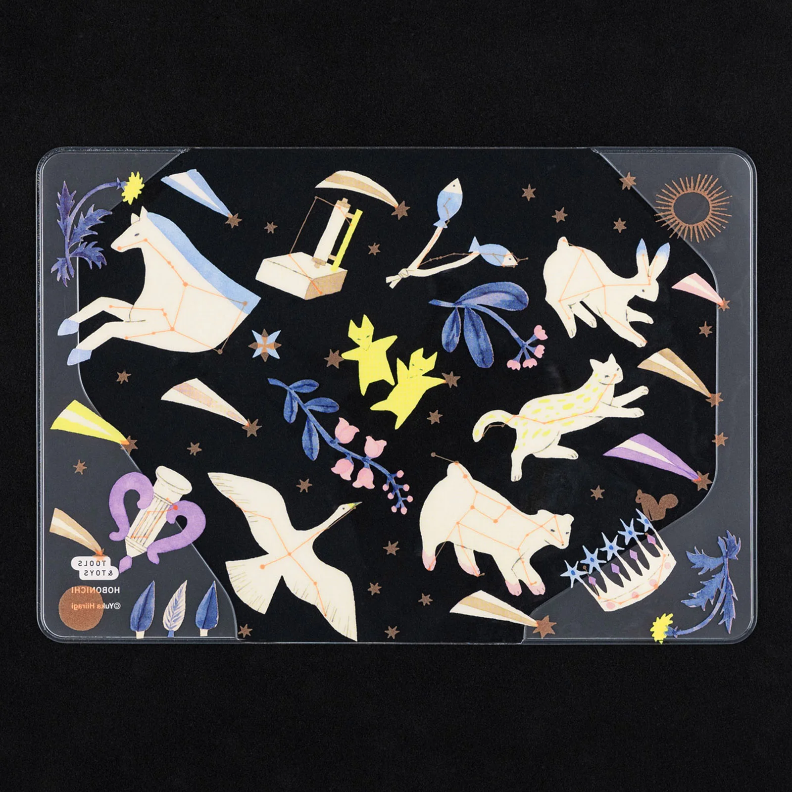 The theme of this design is seasonal constellations. Illustrated in gentle, calm colors are various constellations, including Lepus (the hare) in the winter, Ursa Minor (the bear cub, also known as the Little Dipper) in the spring, Cygnus (the swan) in the summer, and Pegasus in the fall. Having a theme with the moon, stars, and sun printed in elegantly shiny copper ink gives this design a nice, mature feel.