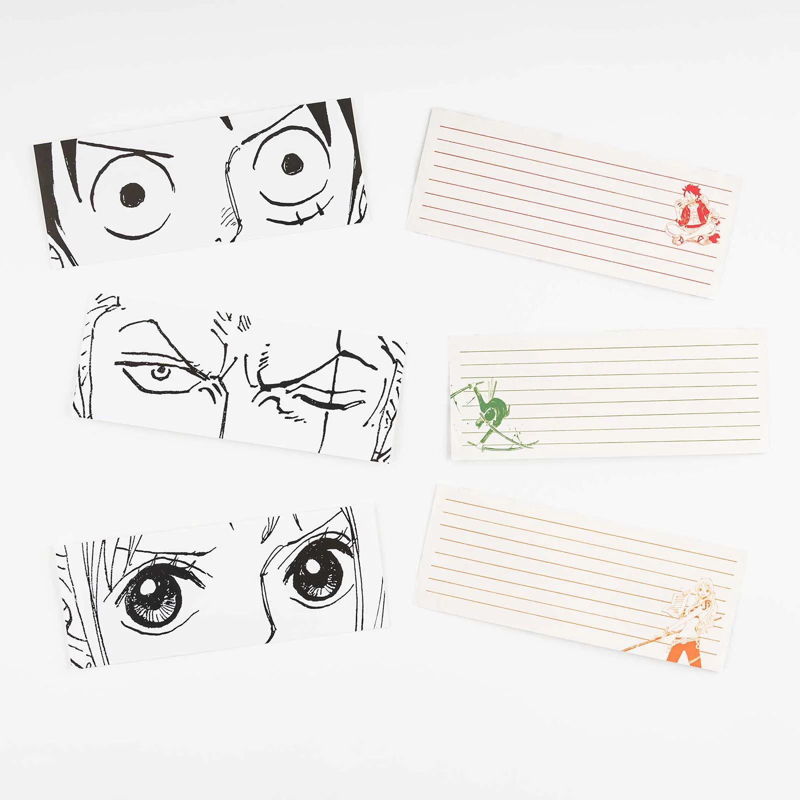 This bold letter set depicts the eyes of the main character Luffy and the rest of the ten Straw Hat Pirates on one half of each paper. You can play around with the paper by holding it up to your own face!