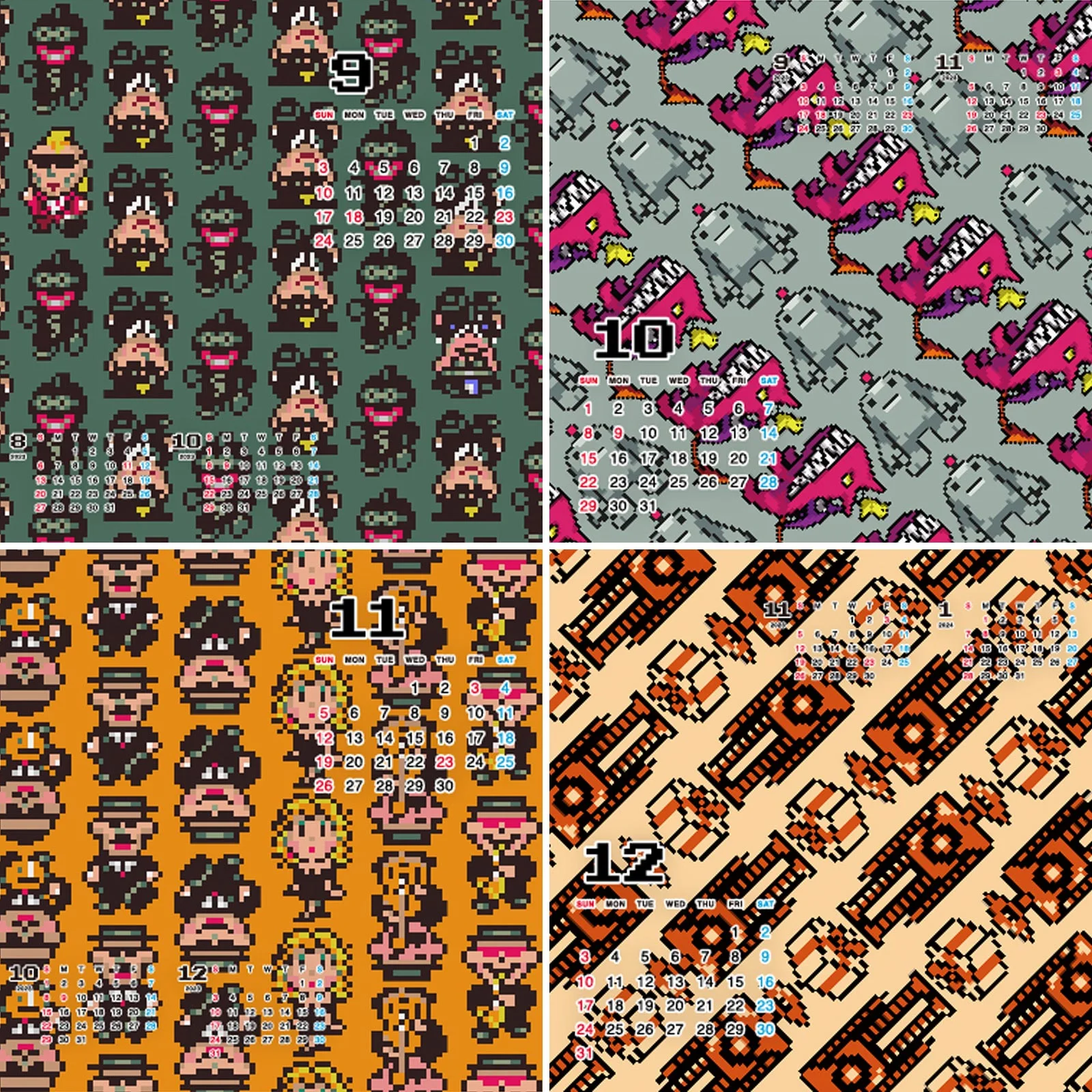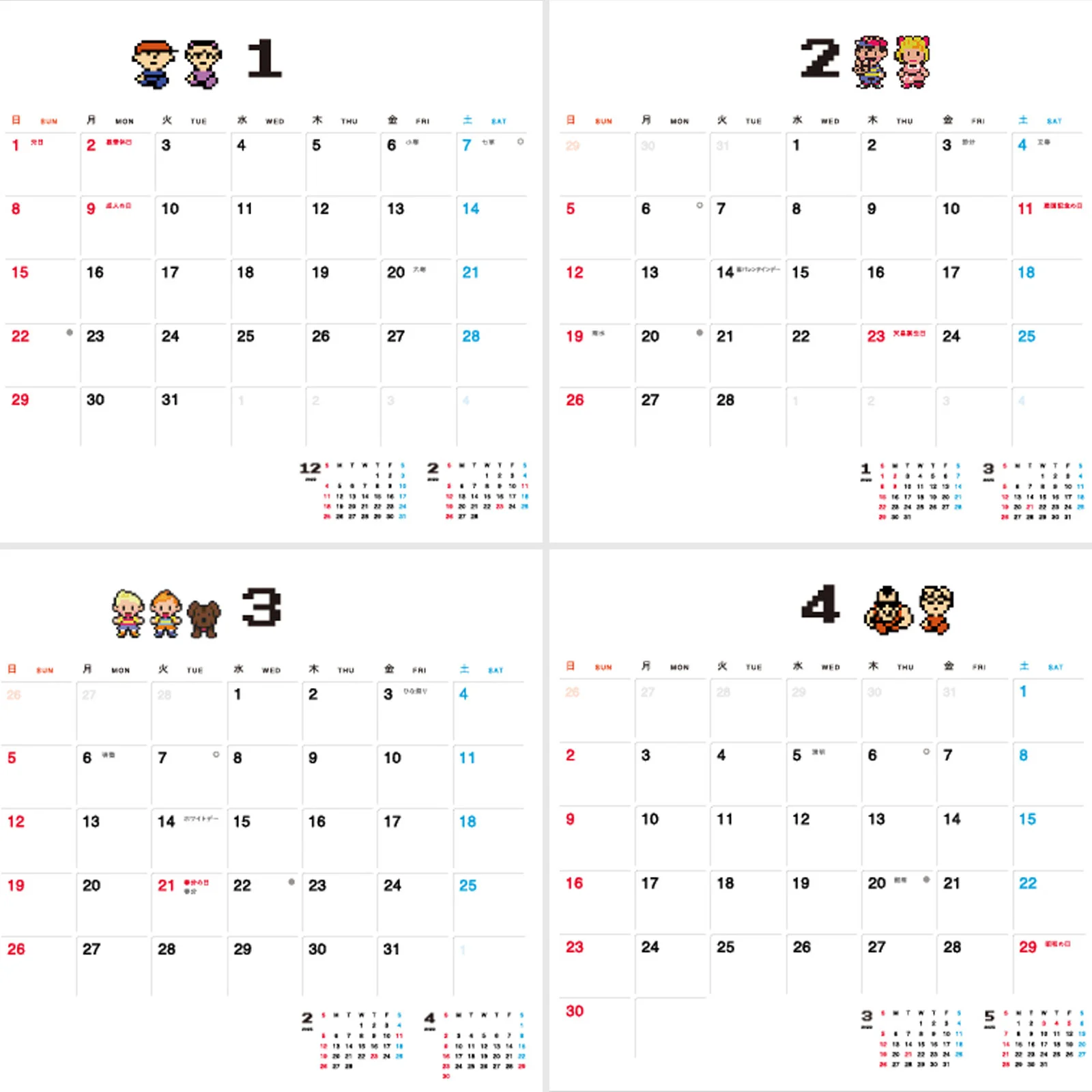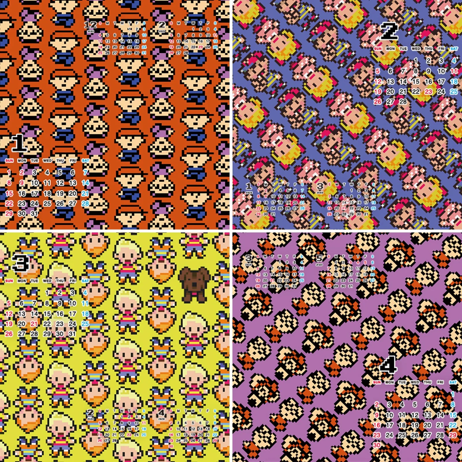 The Desktop size includes characters from across the MOTHER trilogy. The double-sided pages are made with whiteboard paper, with one side a calendar with repeating images of characters from the game, the opposite side a white calendar with single images of those characters and plenty of room to write. In other words, you get one calendar with two designs.