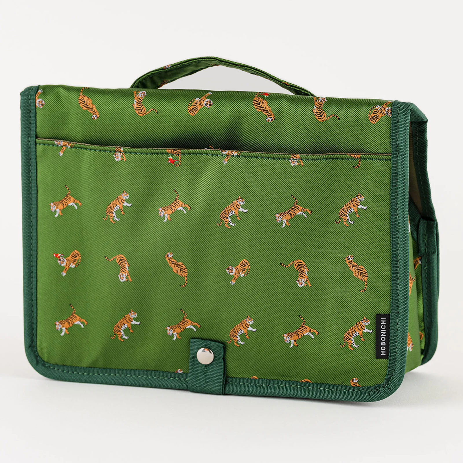 Bow & Tie: Forest Tiger uses the design from the 2022 Hobonichi Techo Weeks book of the same name. The textured, shiny fabric is the same used in neckties, and gives this design a cool look. The piping is a deep green, and the pouch interior is khaki colored.