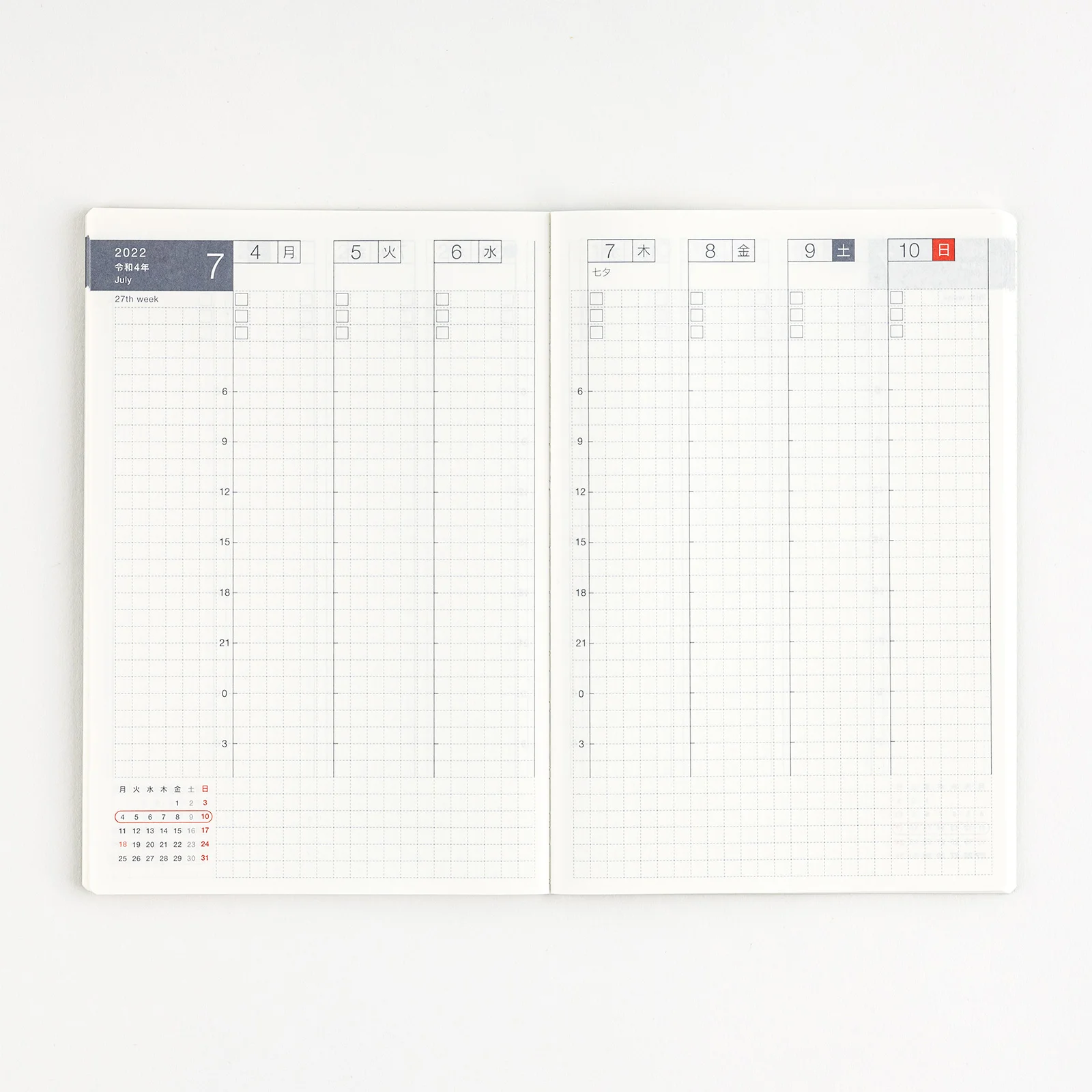 This weekly calendar is a supplement to the A6 Hobonichi Techo Planner / Original. Each two-page spread covers an entire week, and the booklet covers an entire year. Each daily column includes a full 24-hour timeline and three checkboxes at the top.