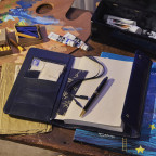 This trifold cover is made of deep navy leather reminiscent of a quiet night sky.