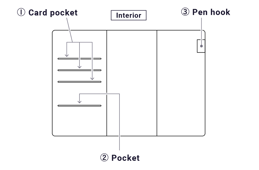 Slim cuts into the leather interior allow it to hold cards the size of a credit card or business card. The pen hook on the right side is designed to hold a pen by its clip.
