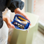 The pouch opens accordian-style and is the perfect size for storing cards. The interior is split into four zones to allow for detailed organization. While compact, the pouch also has enough storage space to hold items with volume, such as lip balm and earbuds.