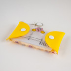 A single sheet of PVC is folded and fastened with a snap button. It can be opened widely to wrap around a card or fasten one of the snap buttons to insert or remove cards from the open side.