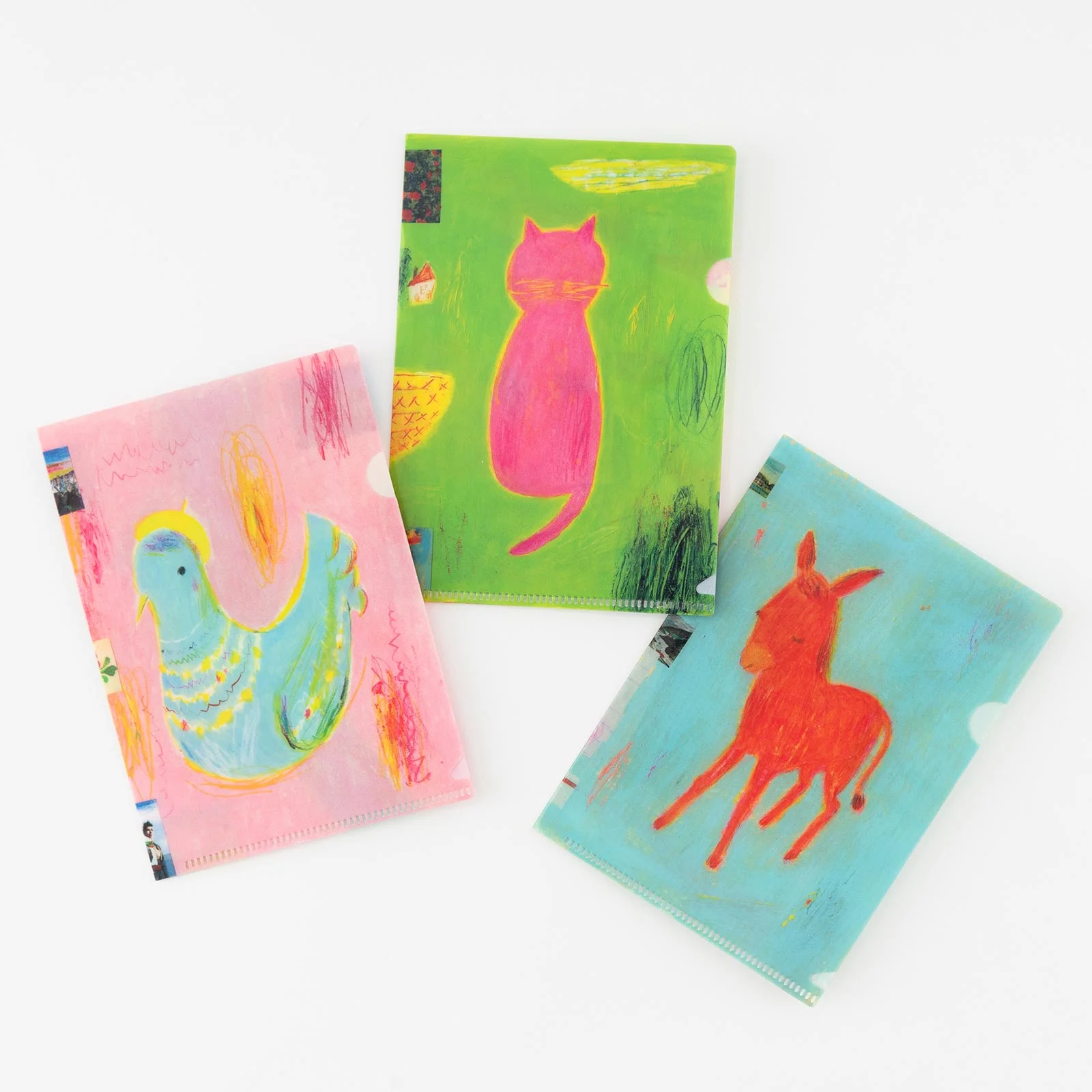 The first folder shows a blue bird all dressed up in a beret and necklaces.