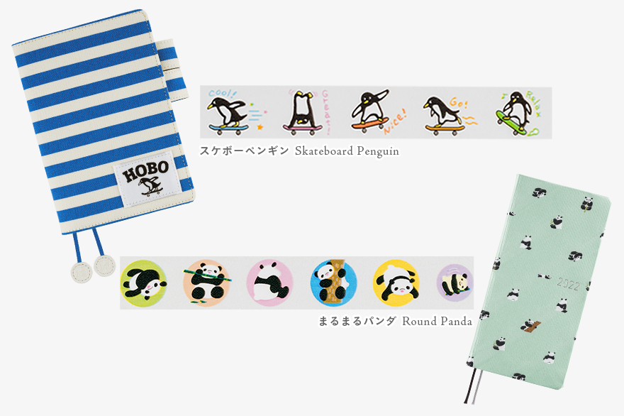 This year, we’re pleased to bring you Deco Rush tape with original designs for the Hobonichi Techo. “Theme of the Day” contains topics for you to write about, “What shall I snack on?” contains popular snacks and foods, and “What a feast!” has an array of delicious meals. Then we’ve got some designs based on techo covers. These include “Skateboard Penguin,” “Round Panda,” “Camp Every Day,” and Cafe Repose.” That makes a total of seven designs to choose from. Each tape roll is 10 mm wide.