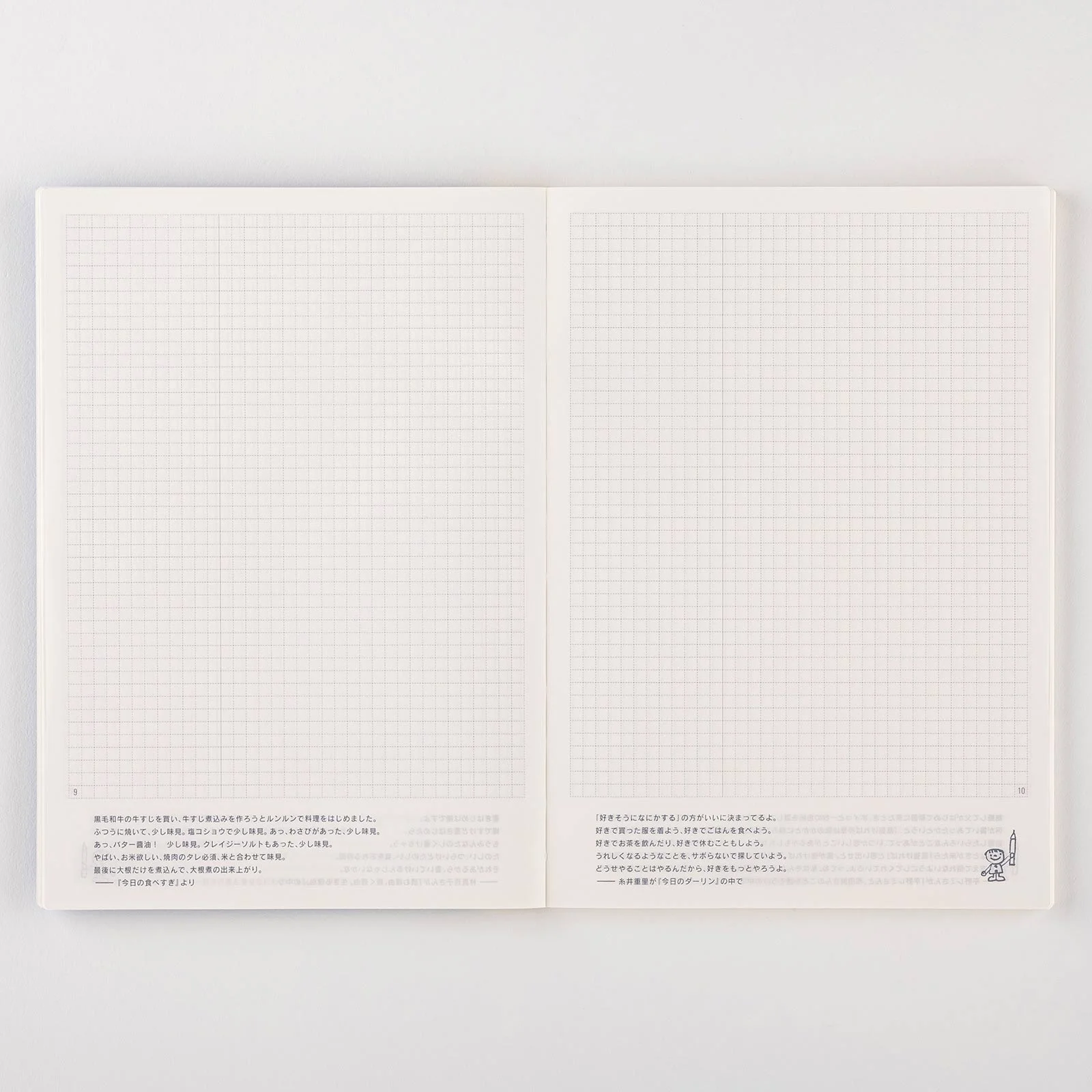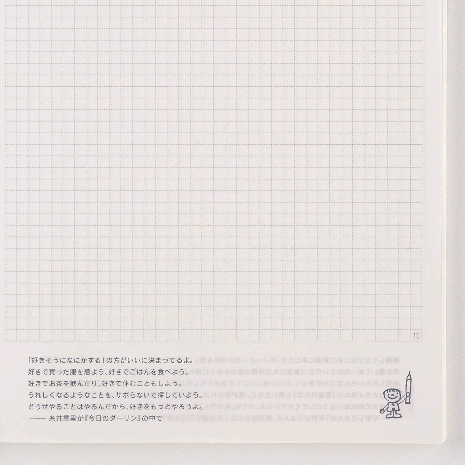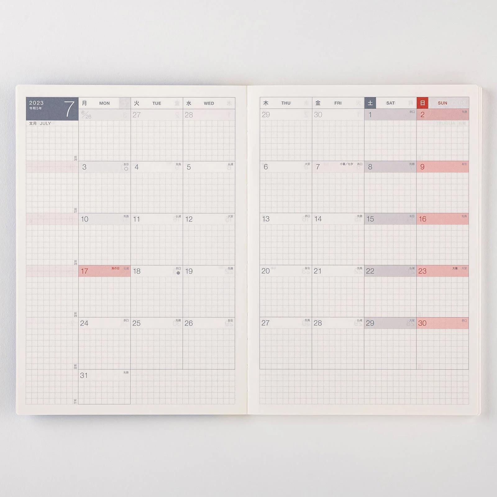The Day-Free Cousin Size is an A5 size monthly techo that is split into two main parts: monthly calendars and a graph-paper notebook. The book fits nicely into covers designed for the standard Hobonichi Techo Cousin.