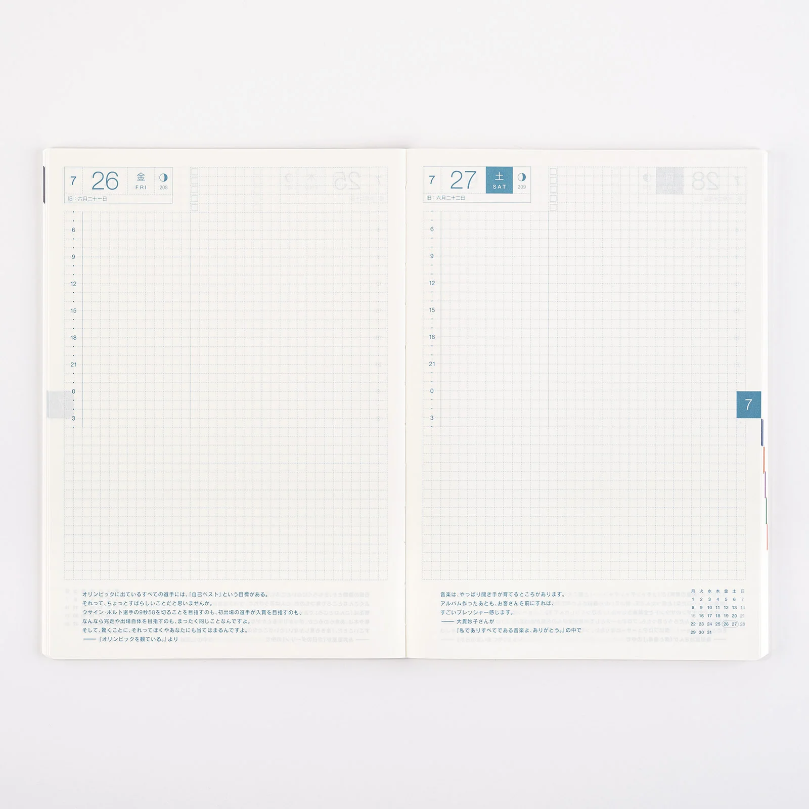 The Avec version splits the Japanese A5 Hobonichi Techo Cousin, design and all, into a 2-book set at six months each with only slight variances in calendar spans and the number of extra pages in the back. This allows you to fill the pages to your heart’s content with scheduling, diaries, little notes, tickets, photographs, doodles, and anything that strikes your fancy.